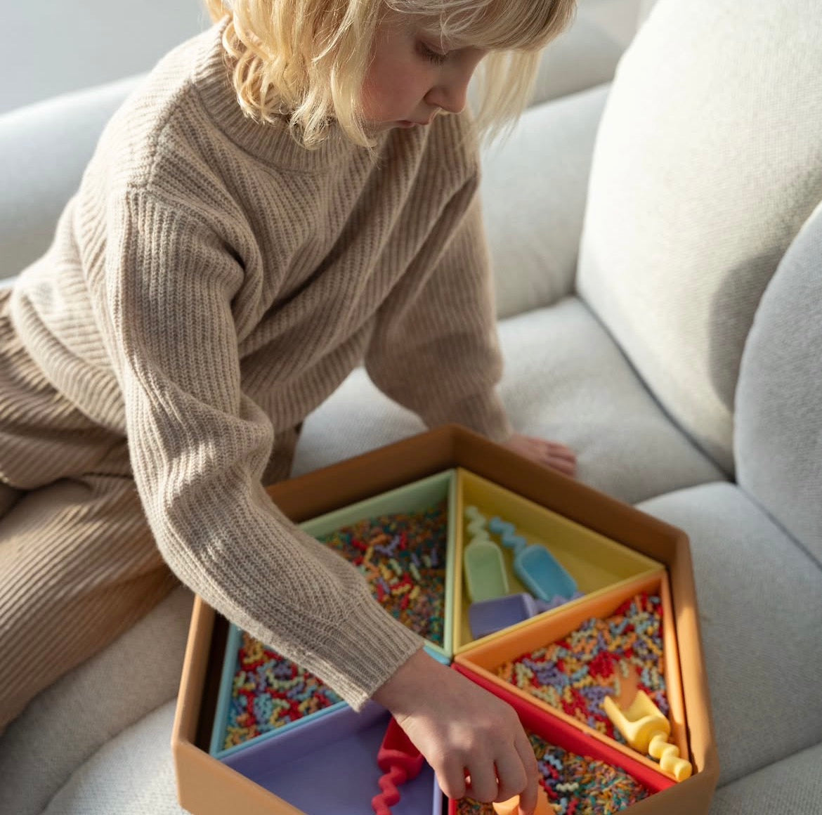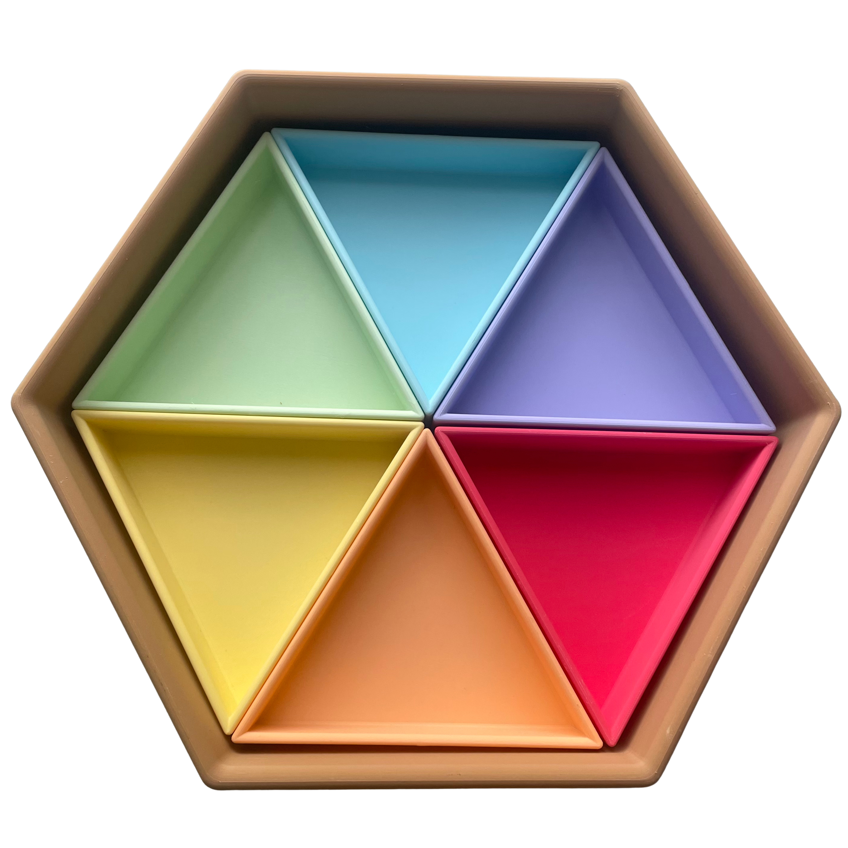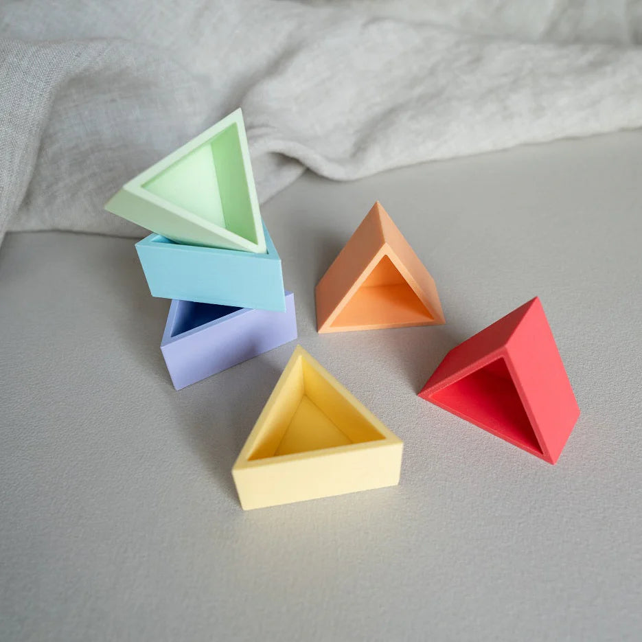 De vorm van de driehoek creëert een duidelijk en stevig vakje. Dat maakt het sorteren van materialen heel eenvoudig. Kleine accessoires, haarelastiekjes of mini speelgoed krijgen allemaal hun eigen plek.