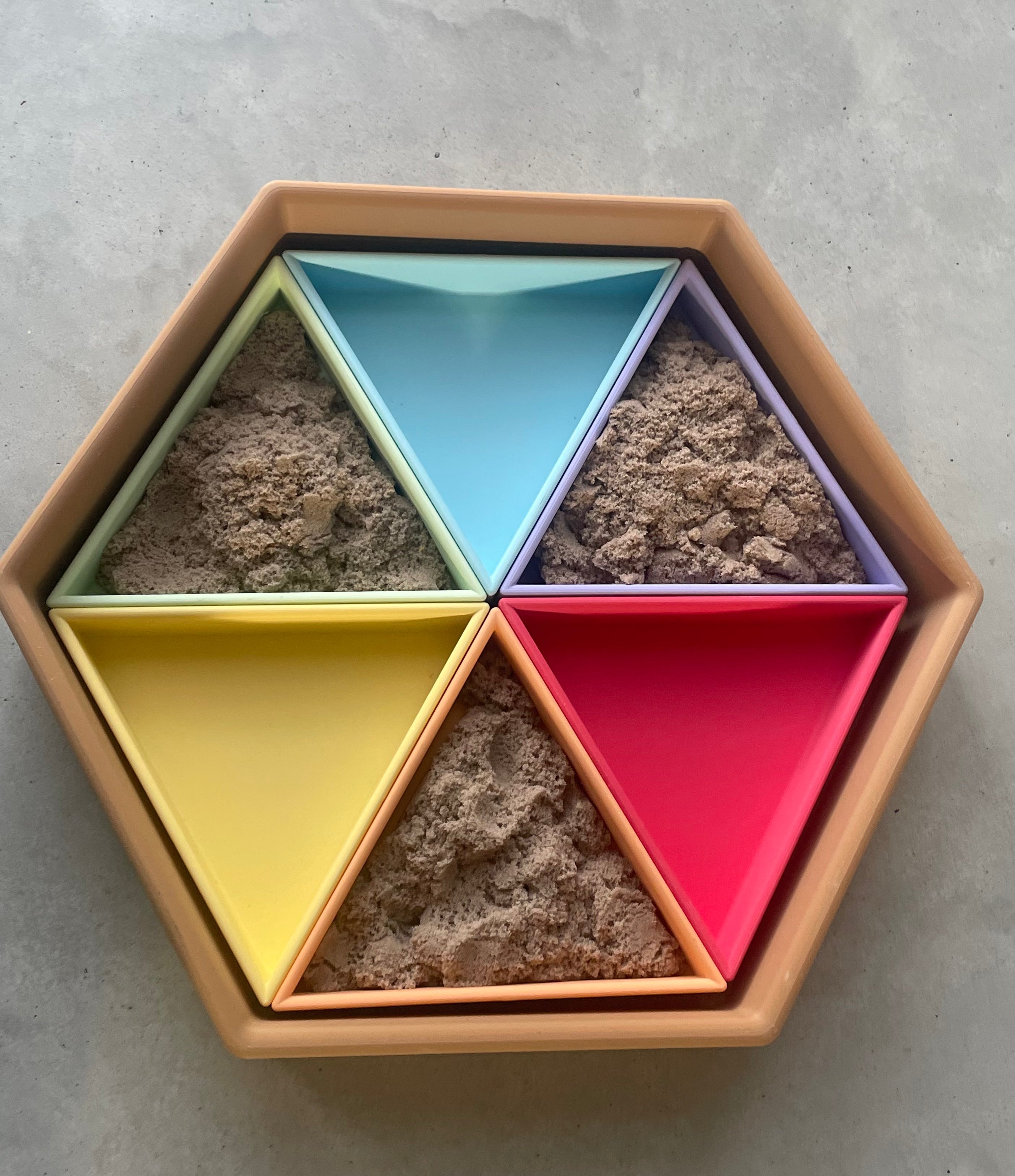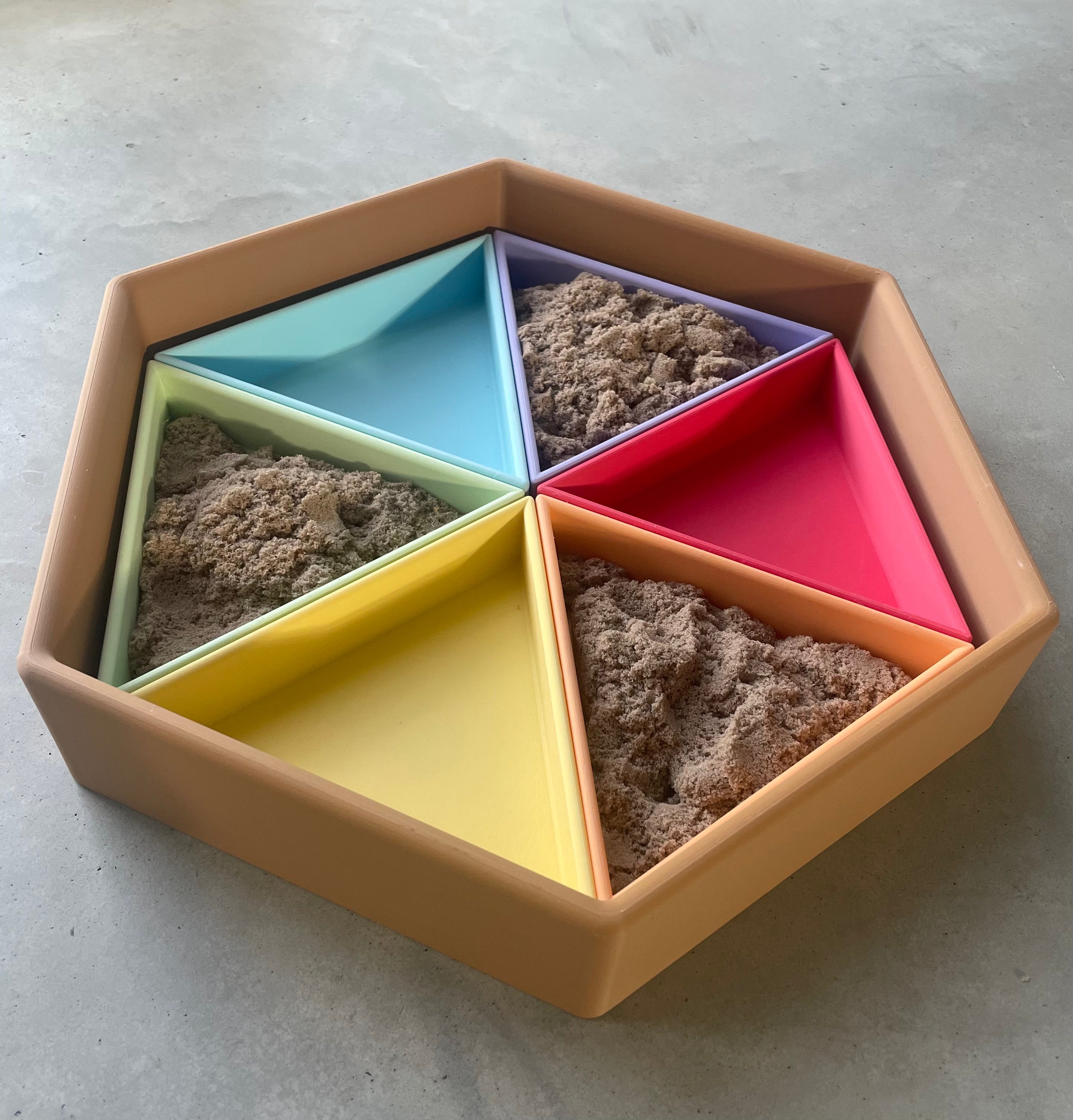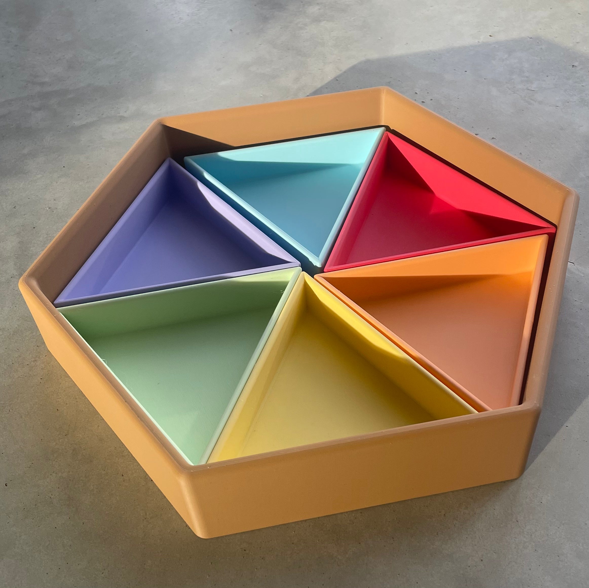 Inhoud: 1 zeshoekige speelbak, 6 inleg driehoeken