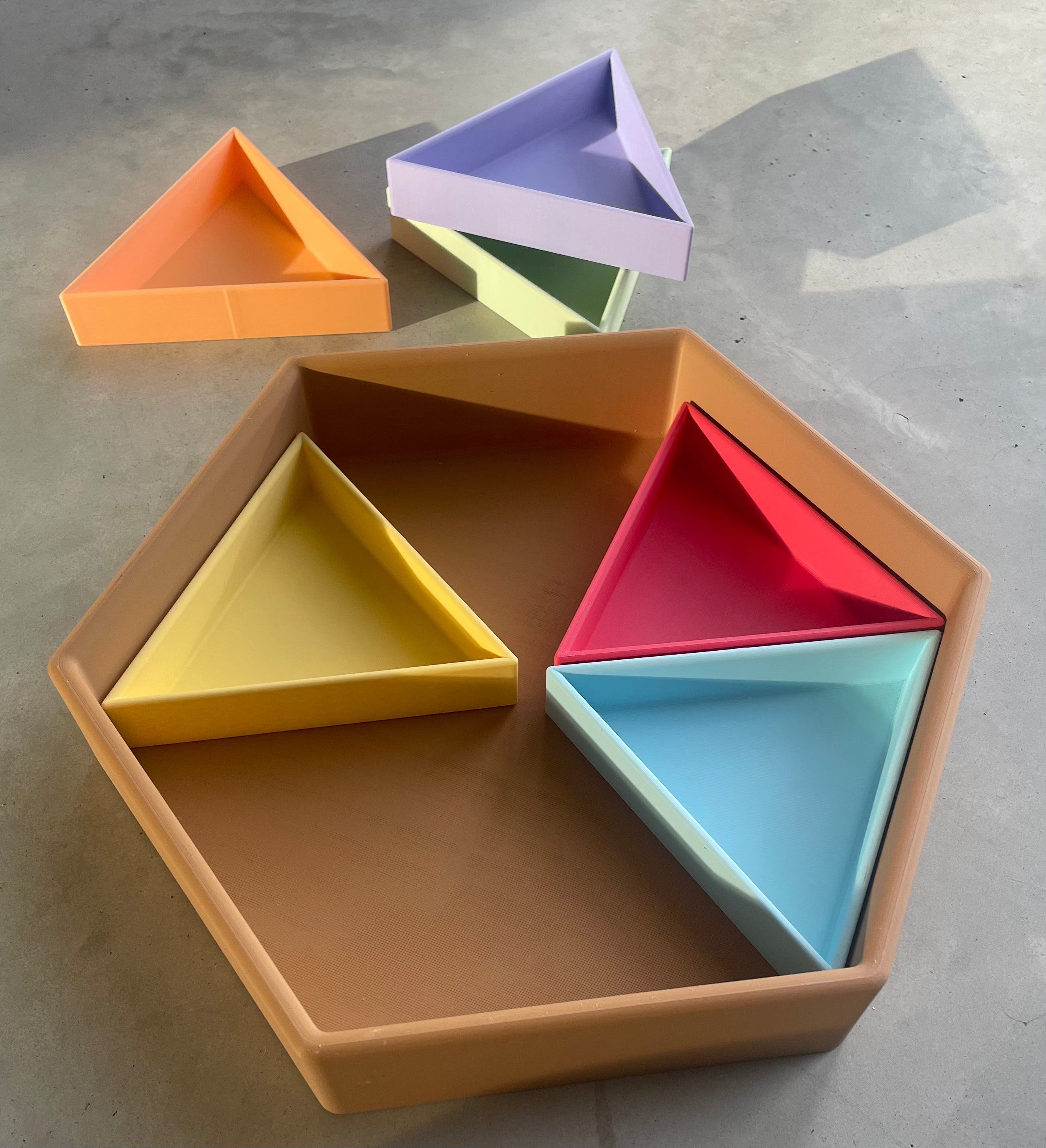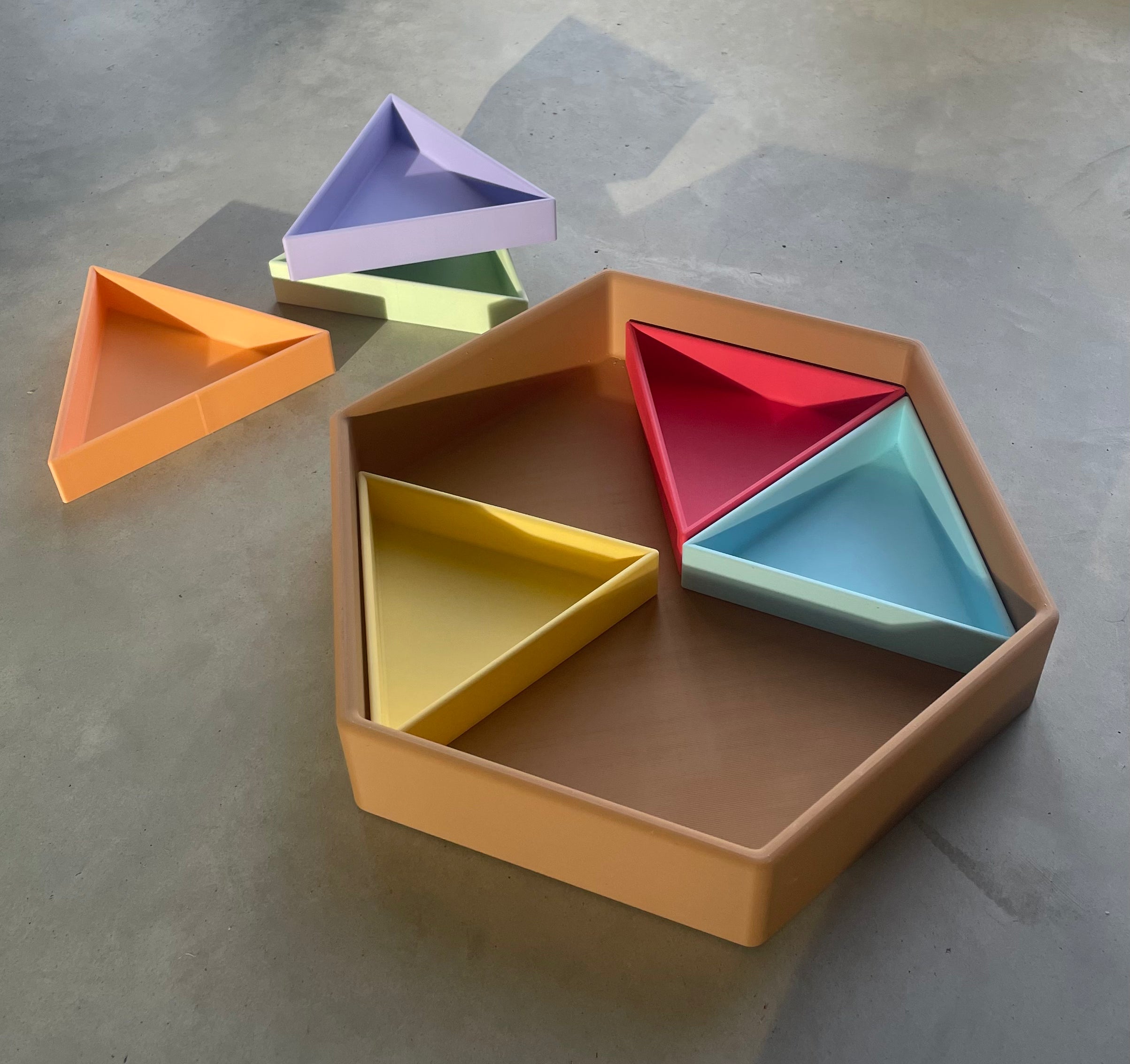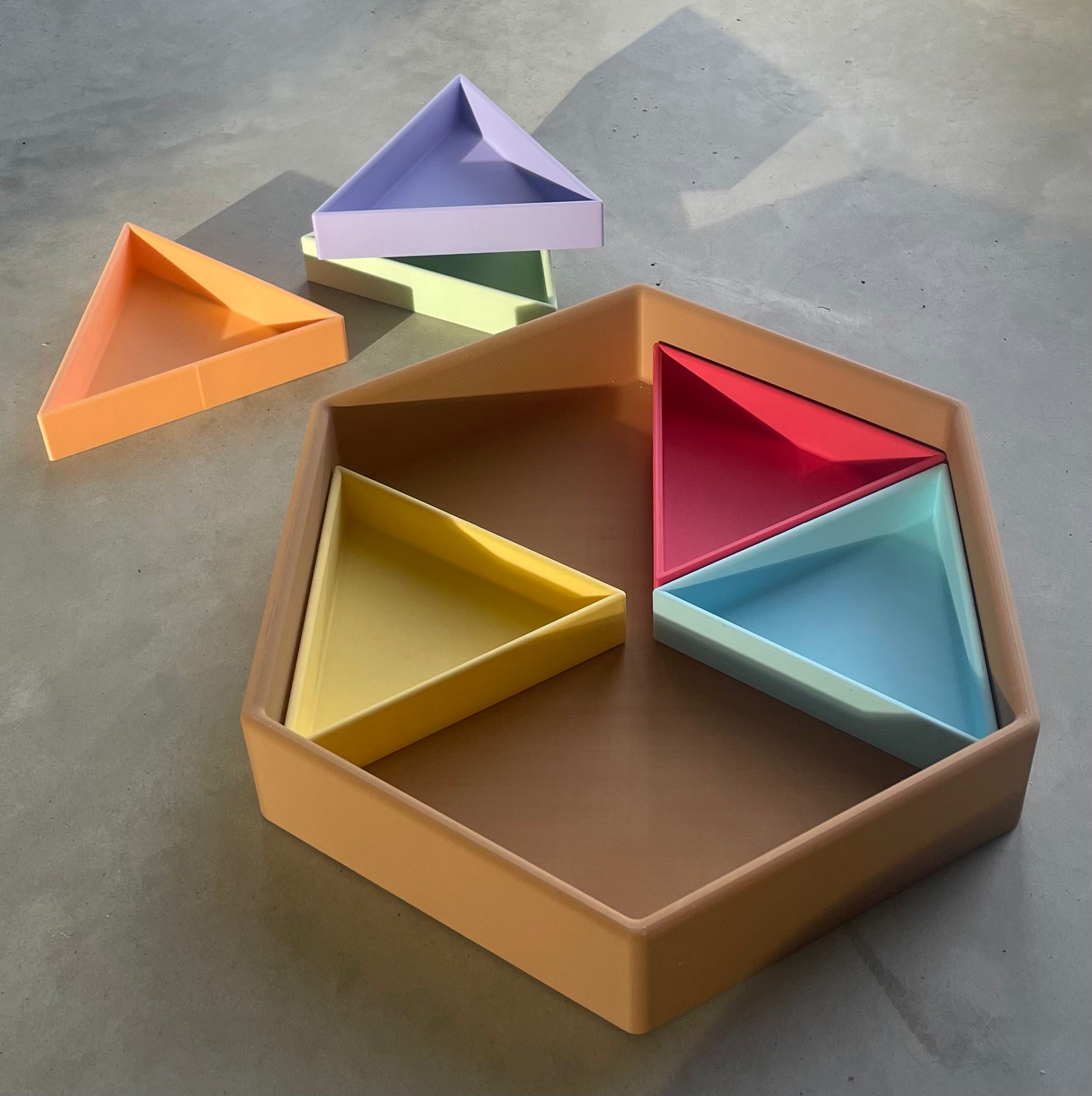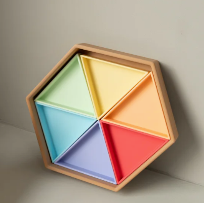 De Mandigo bak met inlegdriehoeken van Grennn zijn ontwikkeld om spel en opbergen zo overzichtelijk mogelijk te maken. Je krijgt bij je aankoop de gehele set. Zo kun je de zeshoek precies indelen op de manier die past bij jou.