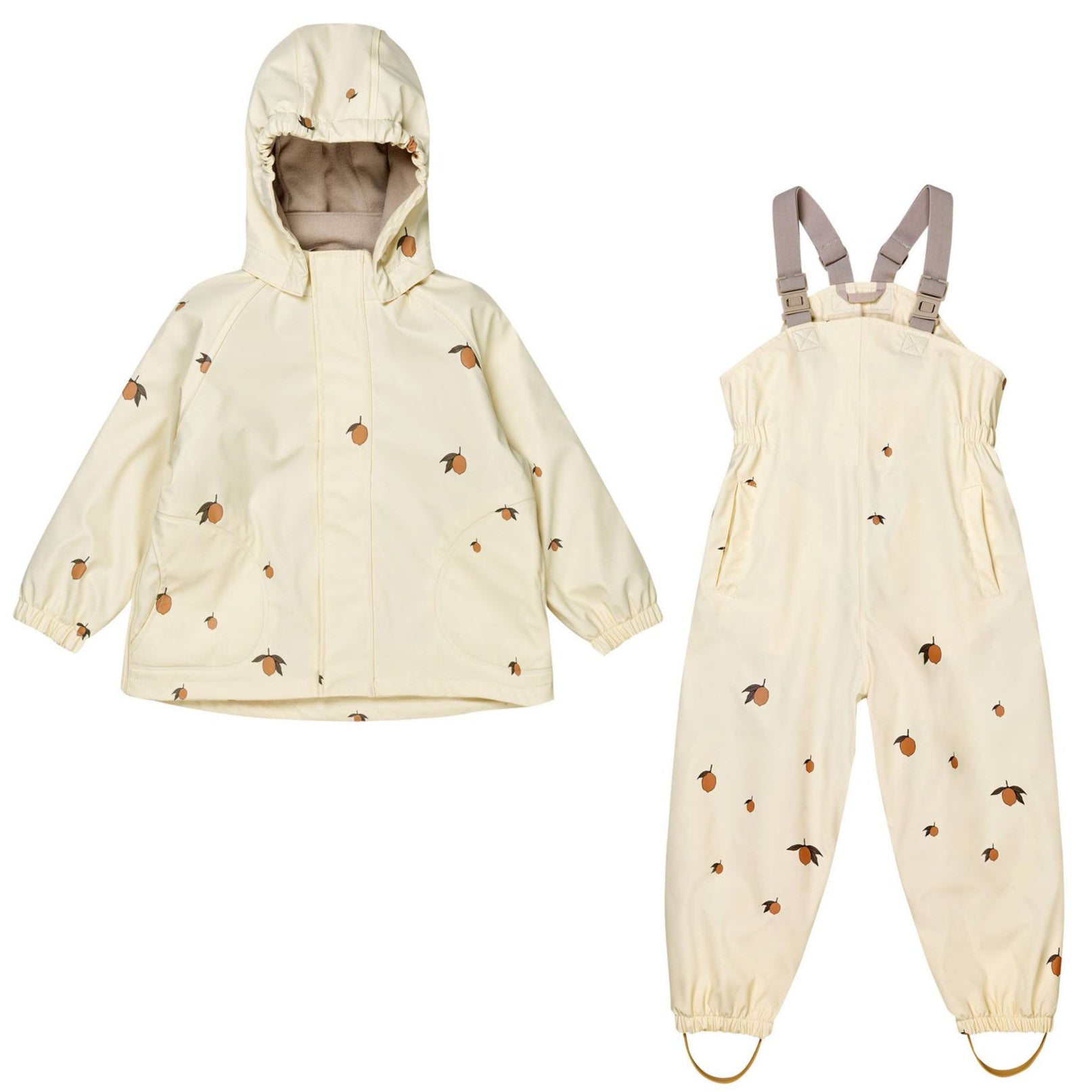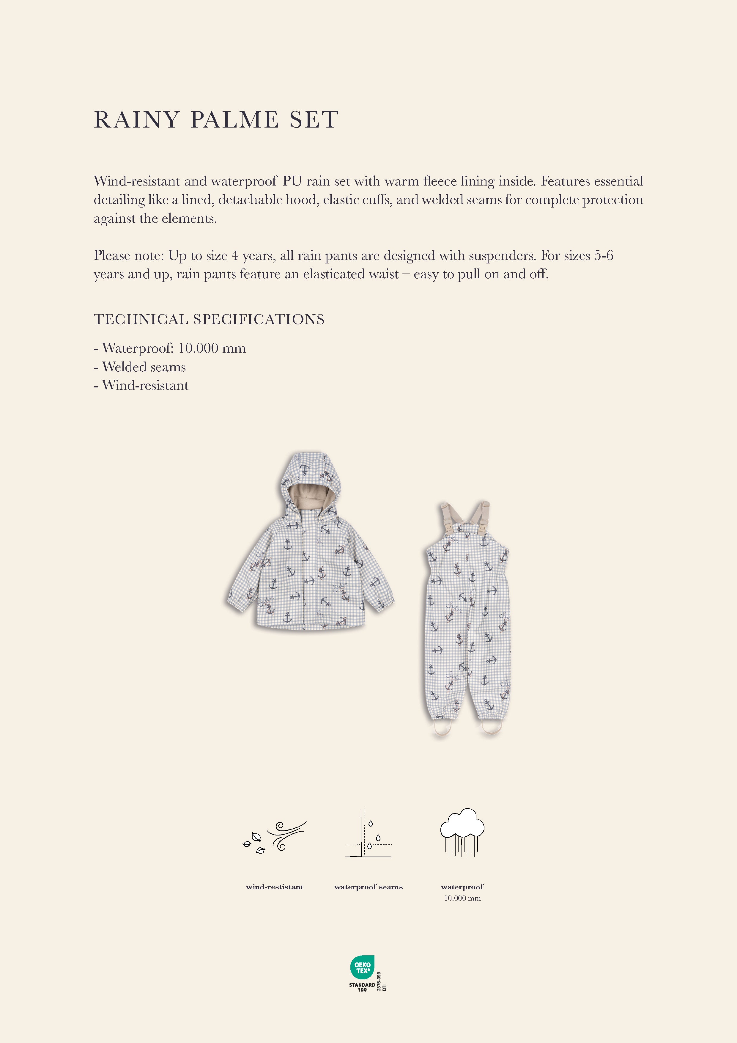 Dit regenpak is gemaakt van wind- en waterbestendig PU-materiaal met een warme fleecevoering aan de binnenkant. Voorzien van een gevoerde, afneembare capuchon, elastische manchetten en gelaste naden voor volledige bescherming tegen regen en wind. De regenbroek heeft tot maat 4 jaar bretels, en vanaf maat 5-6 jaar een elastische taille voor eenvoudig aan- en uittrekken.