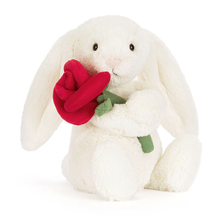 Deze Cream Bunny with Rose is een zacht knuffeldier in de vorm van een konijn, afgewerkt met een roosdetail. Het knuffeldier is vervaardigd uit hoogwaardig, zacht materiaal en ontworpen voor veilig en langdurig gebruik.