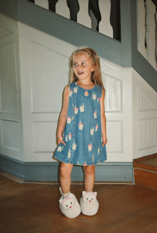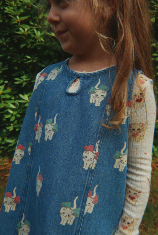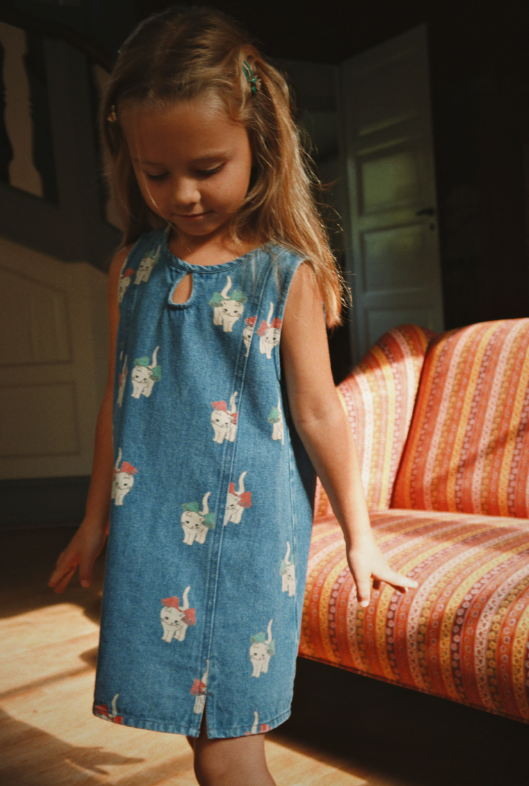 De Magot Denim Jurk van zachte denim kwaliteit. Ontworpen in een klassiek A-lijn silhouet en sluit aan de achterkant met een enkele hartvormige knoop. Gemaakt van 100% biologisch katoen.