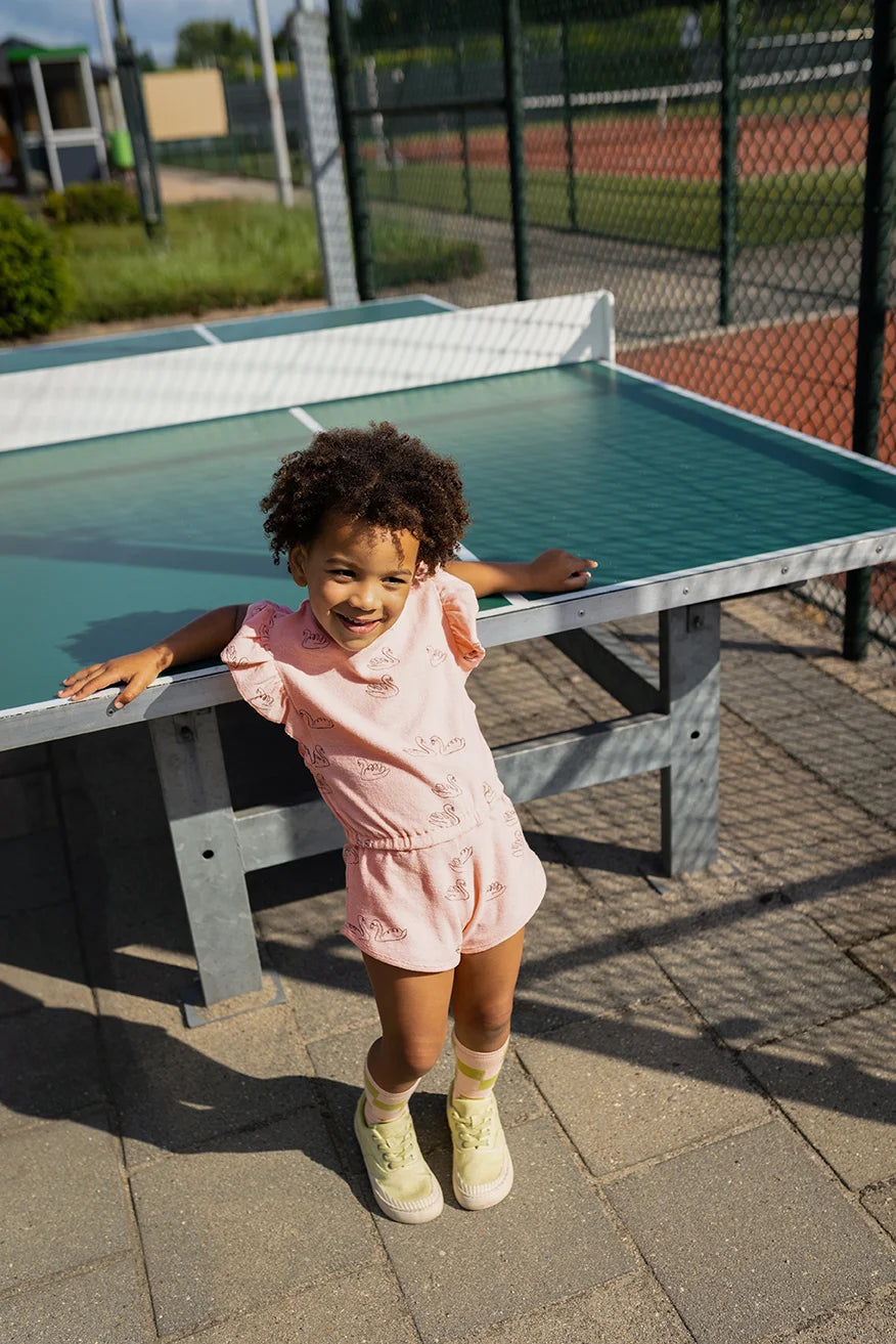 Versierd met een subtiele all-over print van elegante zwaantjes en afgewerkt met ruffles aan de korte mouwtjes, straalt dit pakje charme en zachtheid uit. De korte broekspijpen maken het perfect voor zonnige dagen, terwijl het 100% biologische katoen zorgt voor ademend comfort en een zachte feel. Ideaal voor kleine dagdromers die houden van stijl én vrijheid om te bewegen.