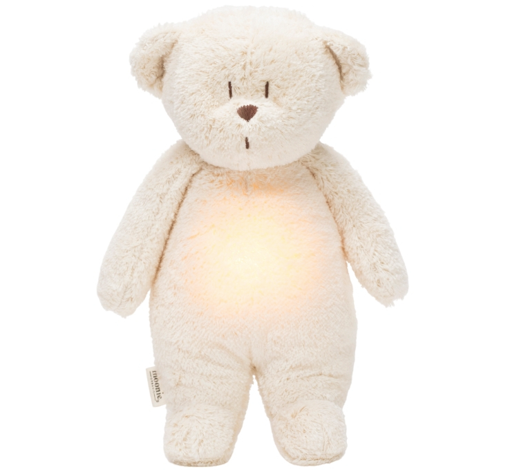 De knuffel is gemaakt uit heerlijk zacht organisch katoen en heeft 5 natuurlijke, kalmerende geluiden die een rustige slaap bevorderen. Daarnaast kan je kiezen uit 3 verschillende geruststellende melodietjes die uit de buik van de knuffelbeer komen.