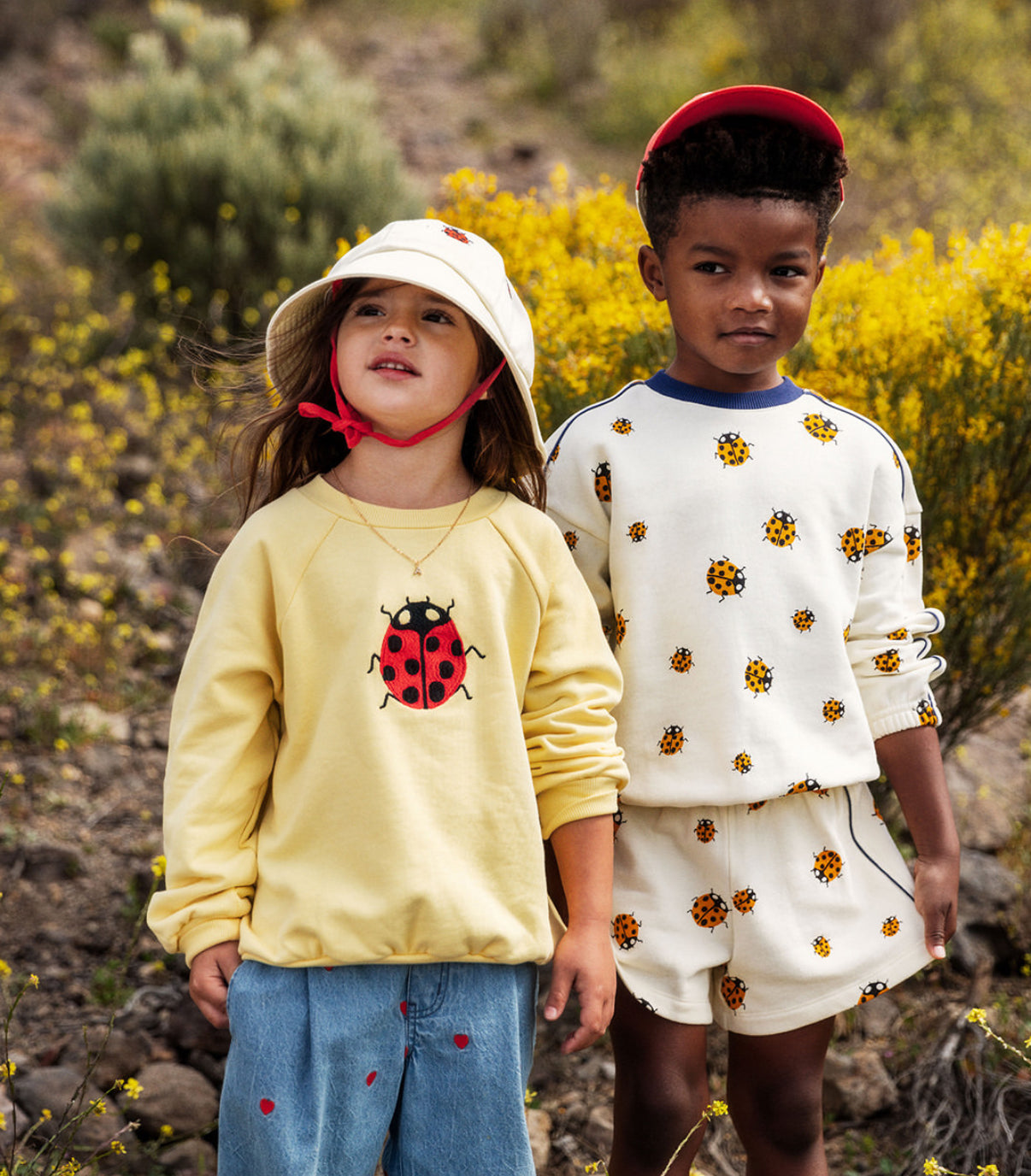 Off white sweatshirt met een lieveheersbeestjesprint, gemaakt van 100% GOTS-gecertificeerd biologisch katoen. Ontworpen voor een relaxte pasvorm met verlaagde schouders, afgewerkt met een geribbelde kraag en elastische boorden.