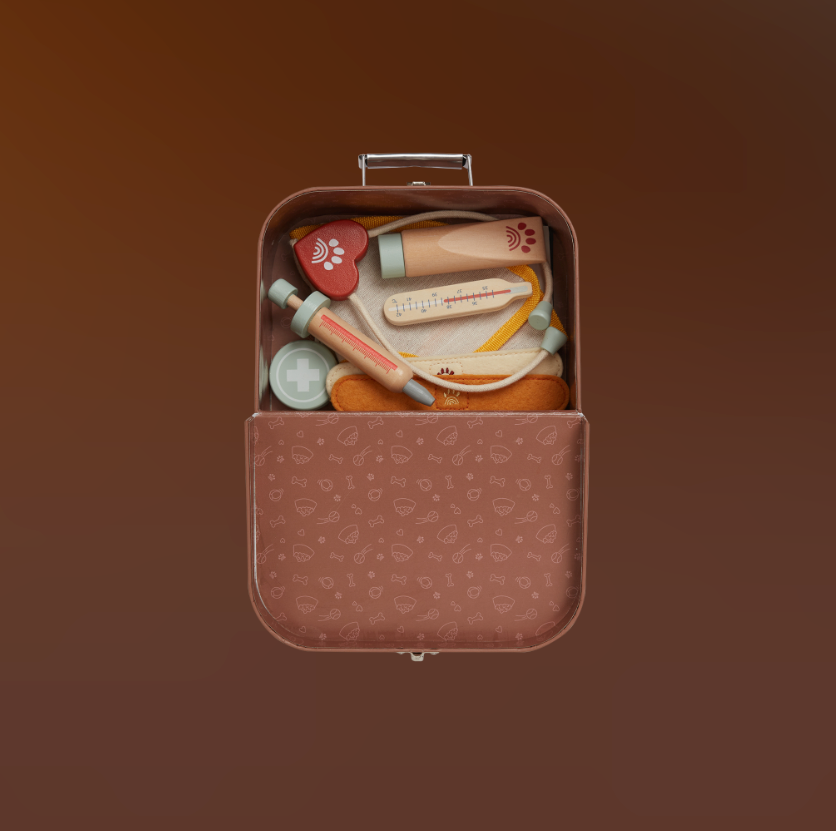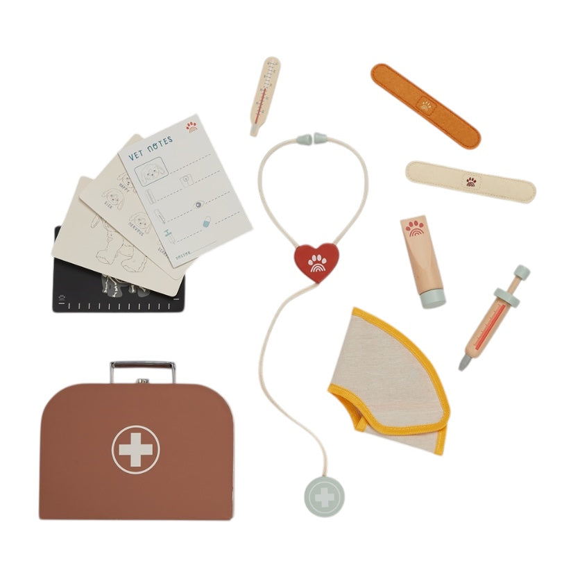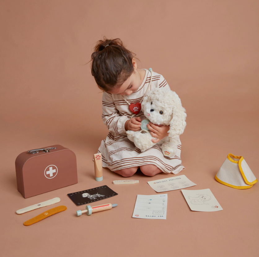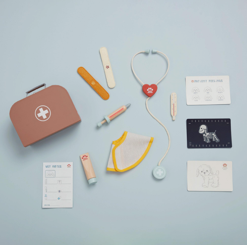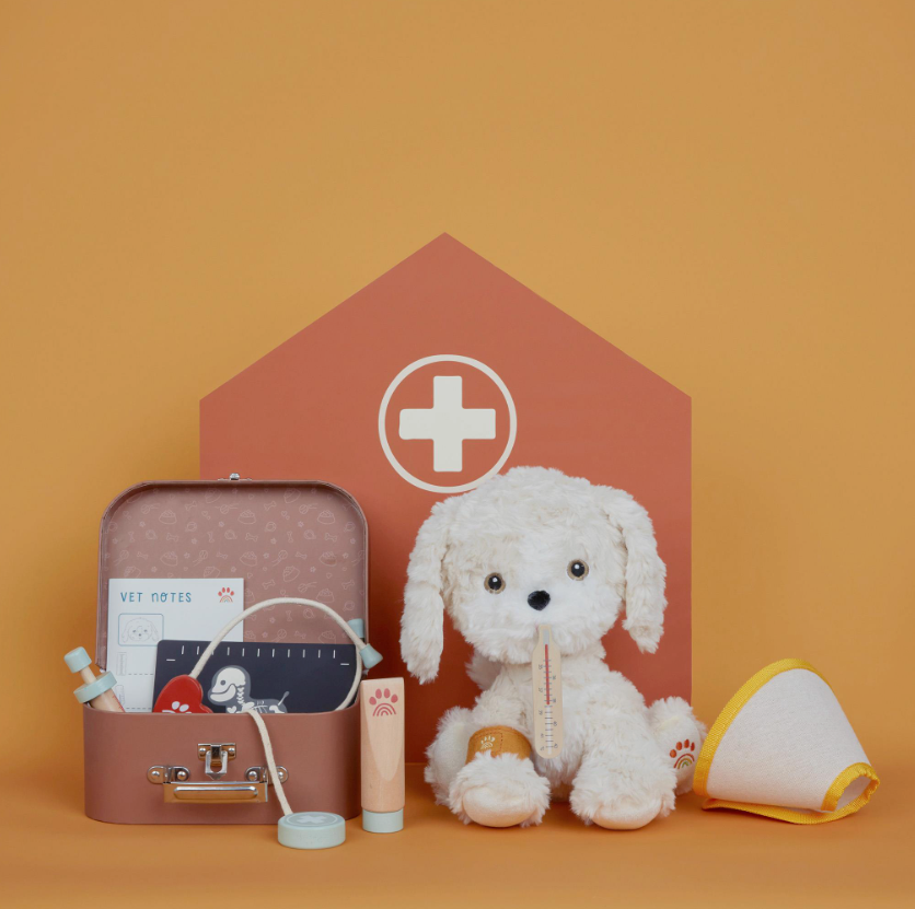 Of je kind nu droomt van een carrière als dierenarts of gewoon dol is op zijn pluche puppy’s, de Vet Set zorgt voor plezier, lachjes en een heleboel knuffelliefde. De set bevat een magnetische houten thermometer, stethoscoop, spuit, zalfbuis, viltpleisters met klittenband en een busterkraag. Op de medische notitieblok en met de patiëntkaarten kunnen kleine dierenartsen hun diagnoses bijhouden en elk “pupje” verzorgen alsof ze echte professionals zijn.