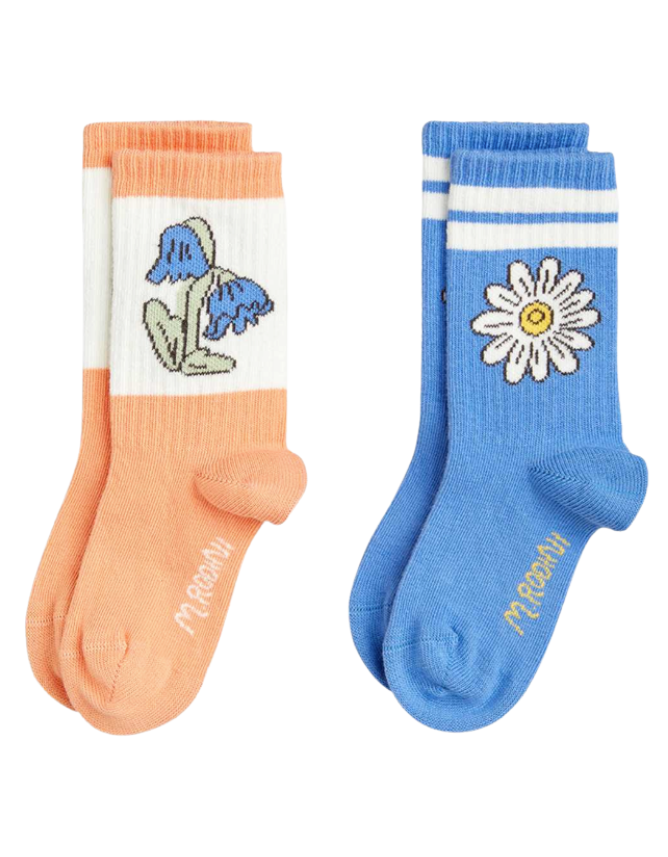 2-pack basissokken met superleuke prints, gemaakt van een GOTS-gecertificeerde mix van biologisch katoen en polyamide met stretch. De sokken zijn zacht om aan te raken, comfortabel rekbaar en hebben verstevigde teenkappen en hielen. M.Rodini is onder elke voet bedrukt.