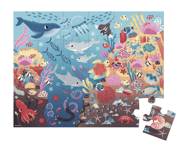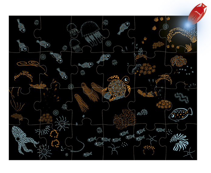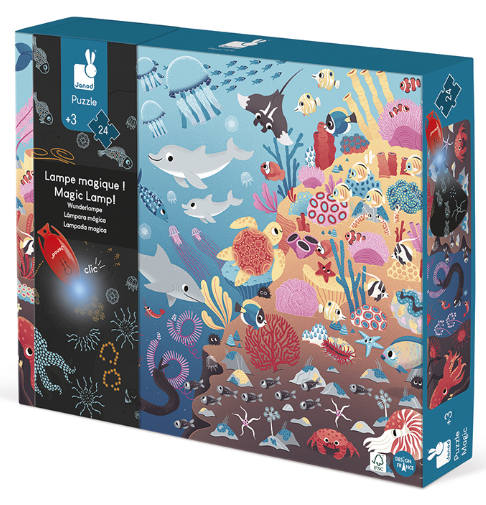 Magische 24-delige puzzel met de zee als thema. Doe het magische lampje branden en ga op ontdekking naar wat er zich diep onder water verschuilt! Dankzij de lamp wordt de puzzel tot leven gewekt en kan het kind verborgen afbeeldingen in de puzzel ontdekken. Een speelse 2- in-1 puzzel die de nieuwsgierigheid prikkelt.