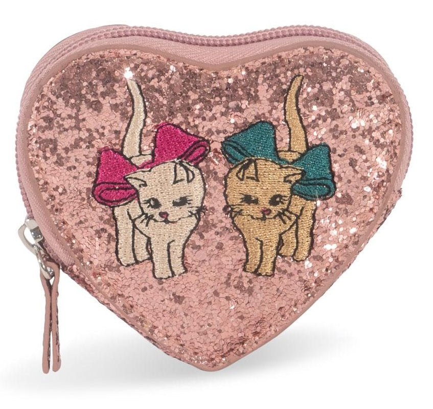 Hartvormige glinsterende portemonnee met poesjes print en pailletten. Met één compartiment en ritssluiting.