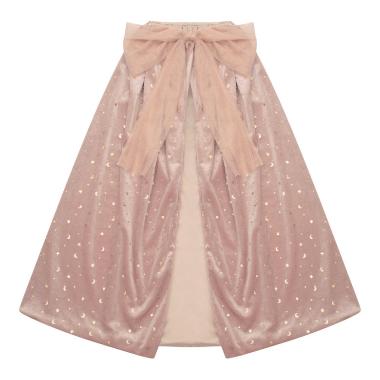 Superzacht roze fluweel versierd met een gouden maan- en sterrenprint, met een zachte oversized strik van tule en satijnen voering.