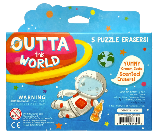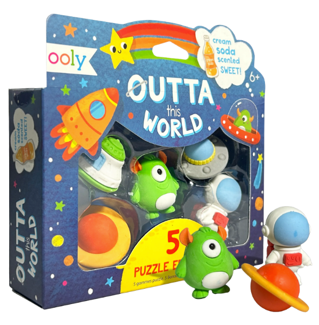 Laat je meevoeren naar een andere planeet met 'Outta this World' geurende gummenset van Ooly! Deze vroljke, ruimte-geïnspireerde gummen ruiken heerlijk en maken elke fout op magische wijze weer goed. Perfect voor jonge ruimtevaarders die graag schrijven, tekenen én fantaseren.