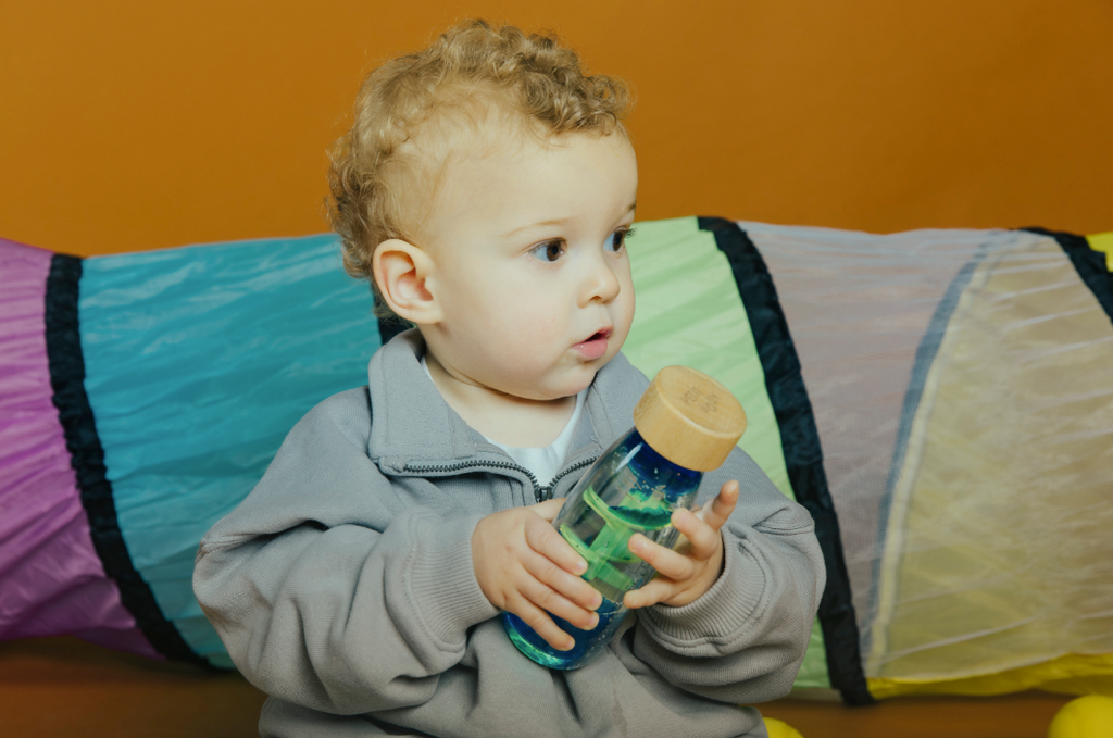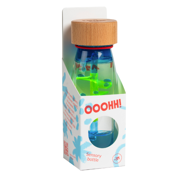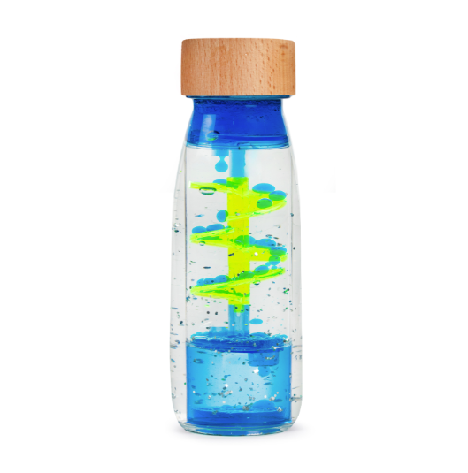 De Petit Boum Sensorische Fles – Spiraal Blauw is ontworpen om kinderen op een eenvoudige en effectieve manier kennis te laten maken met visuele prikkels en beweging. In de fles zweven blauwe spiralen langzaam naar beneden zodra de fles wordt gekanteld of geschud. Dit proces trekt de aandacht en nodigt uit tot kijken, volgen en herhalen.