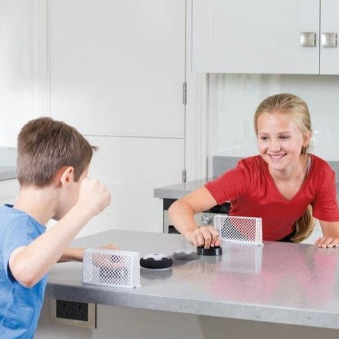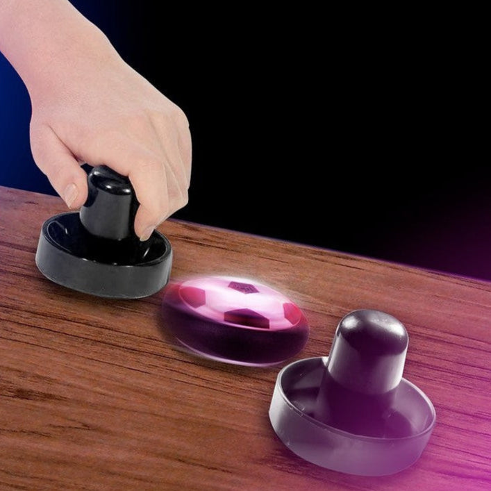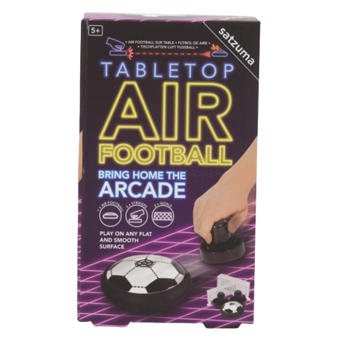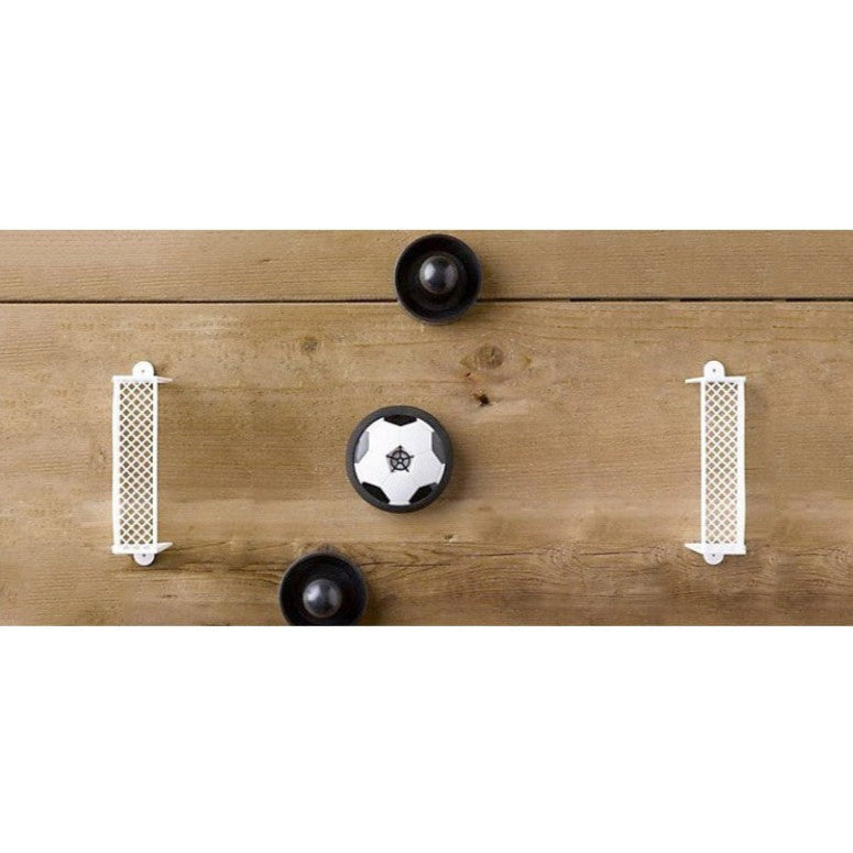 Met de Tabletop Air Football-set voetbal spel voor binnen kun je elke gladde tafel als speelveld gebruiken, met behulp van een puck die over een luchtbed glijdt, twee gedempte spitsen en elke speler een zuignapdoel.