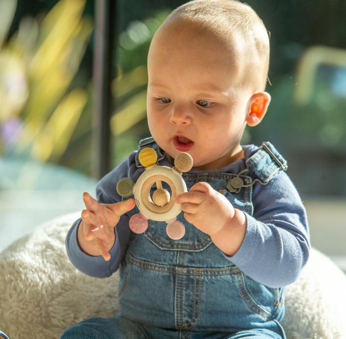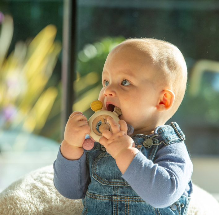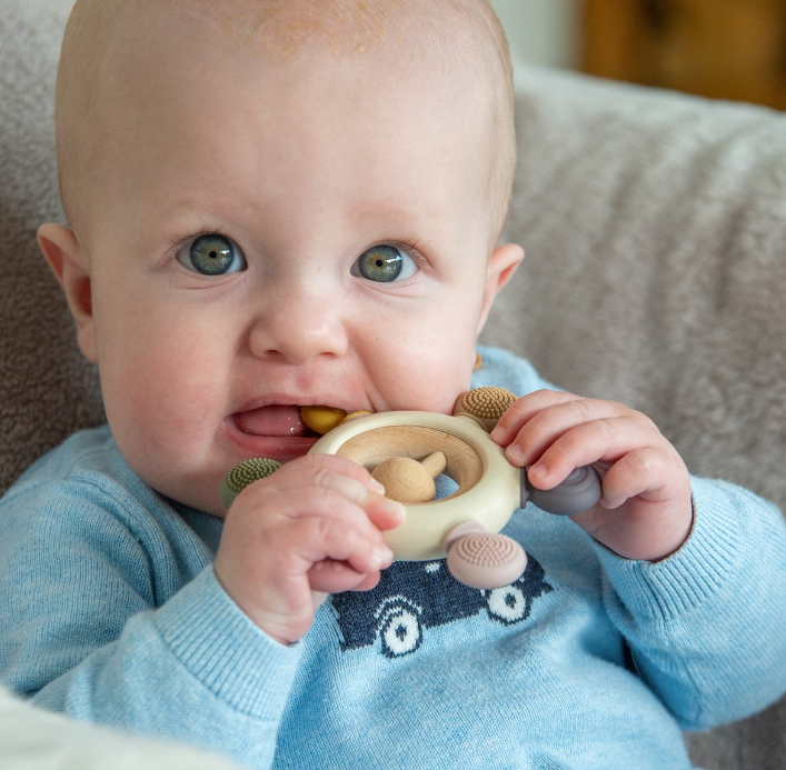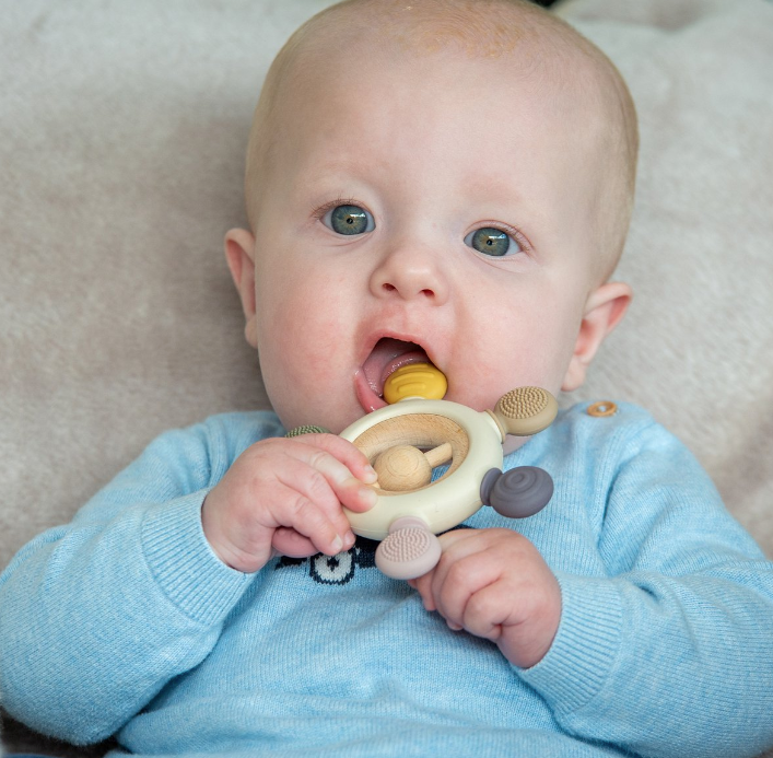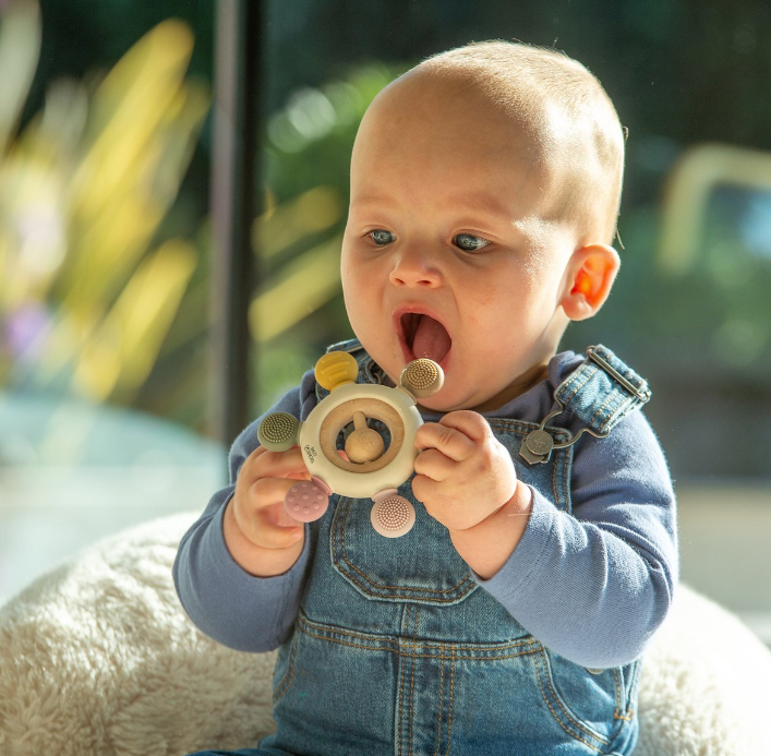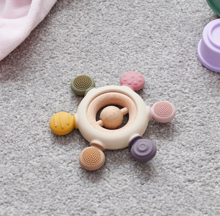 Met verschillende texturen, kleuren en een houten rammelaar in het midden, biedt deze bijtring een leuke afleiding voor jonge baby's. Het houten rammelgedeelte kan worden verwijderd om het siliconen deel te wassen.