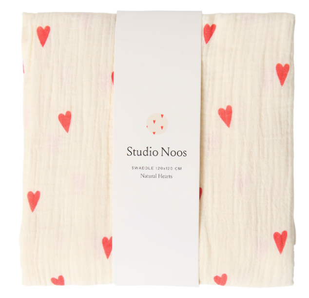 Deze zachte hydrofiele doek van Studio Noos is ecru met schattige rode hartjes, een stijlvolle en warme toevoeging aan iedere babyuitzet. Met een formaat van 120 x 120 cm is deze swaddle ideaal om je baby in te wikkelen, mee te knuffelen of als licht dekentje te gebruiken.