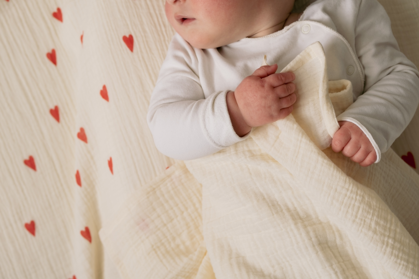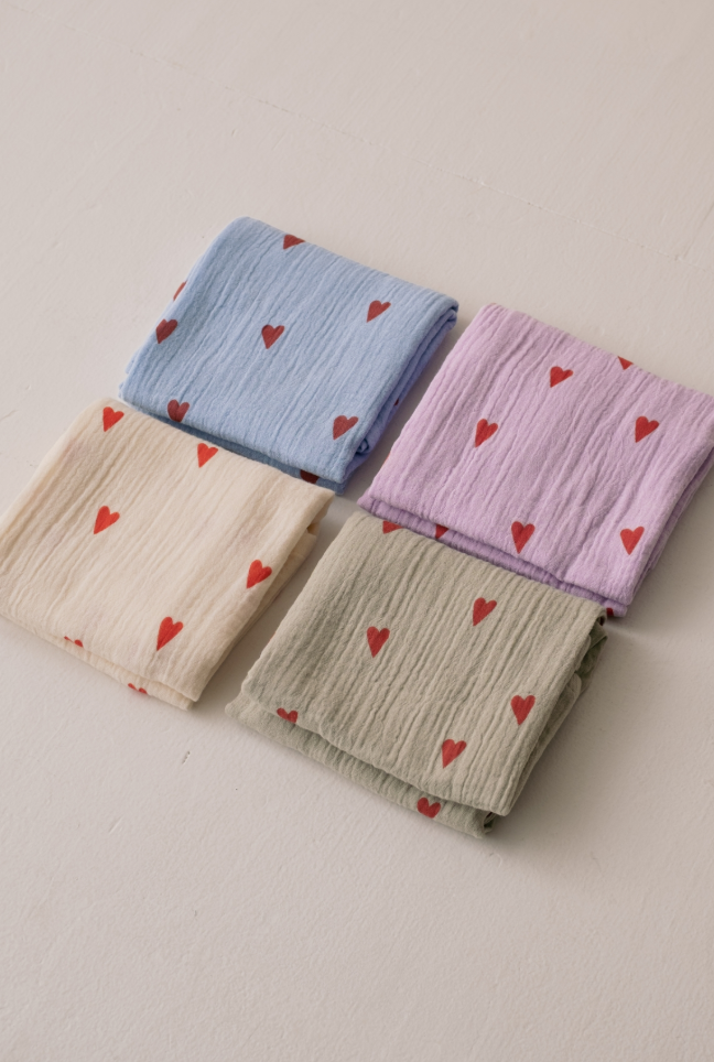 Gemaakt van lichtgewicht, gekreukeld katoen (100%), voelt de doek heerlijk zacht aan en is hij ademend, perfect voor de gevoelige huid van je baby. De speelse print met rode hartjes op een beige achtergrond geeft een charmante, tijdloze uitstraling.