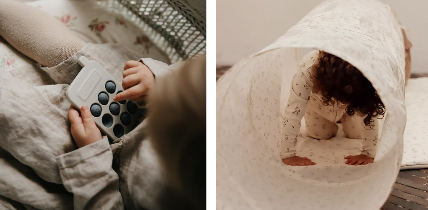 Met motorische cadeaus laat je je kindje bewegen of kan je kindje met bewegende dingen spelen. Zoals spelen met een babygym of een wagenspanner, geluid maken met een rammelaar, spelen met badspeelgoed zitten op een fiets, rijden met voertuigen, kruipen door een speeltunnel, achter een loopwagen lopen of dansen.
