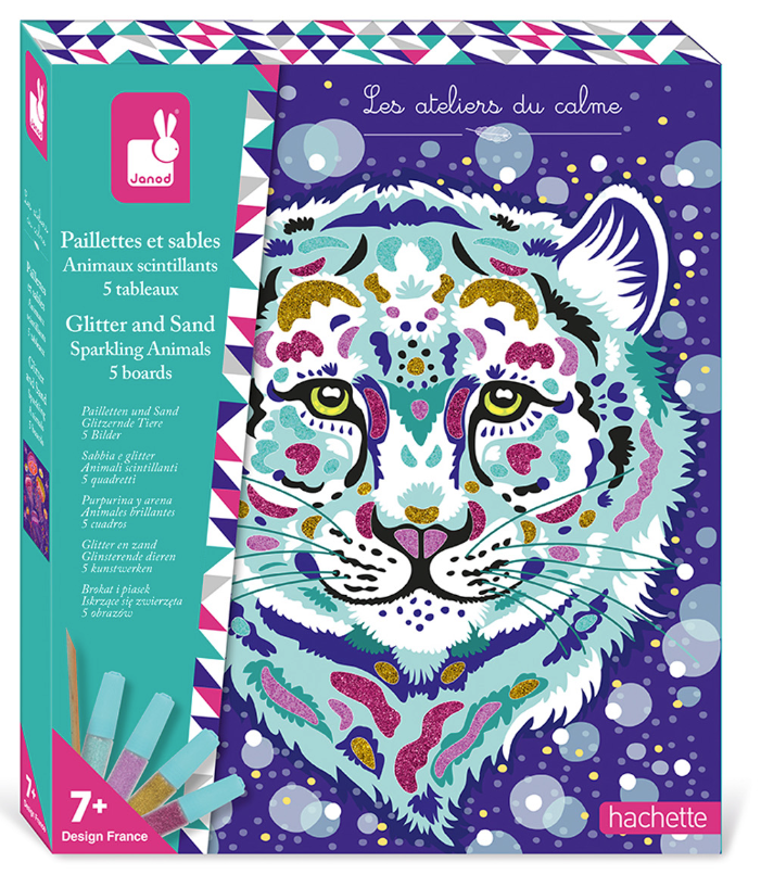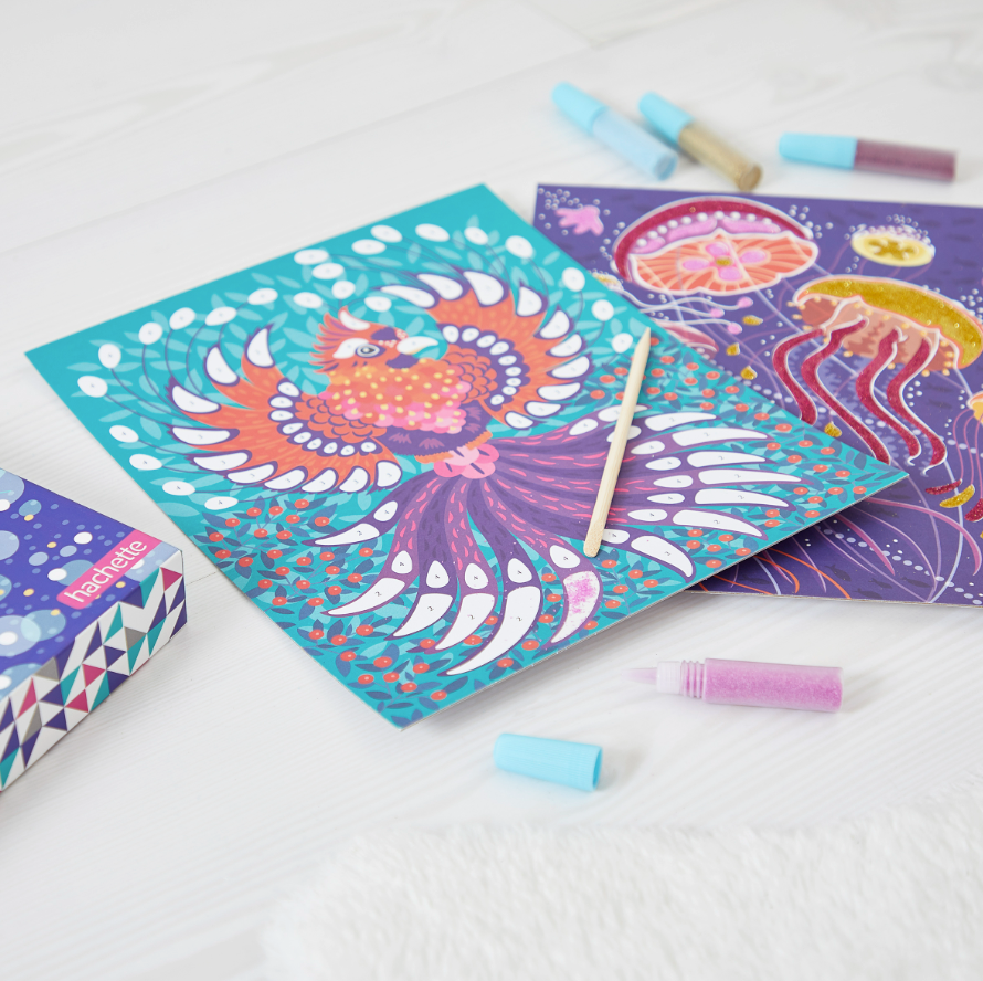 Met behulp van het houten werktuig ontdekken ze stap voor stap de zelfklevende delen van de borden en brengen ze zand of glitter aan volgens de bijgeleverde instructies. Ideaal om creativiteit, concentratie en fijne motoriek te stimuleren.