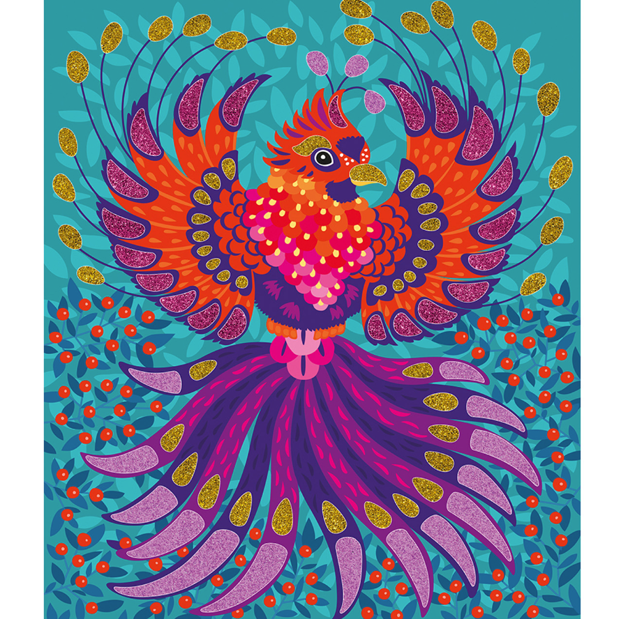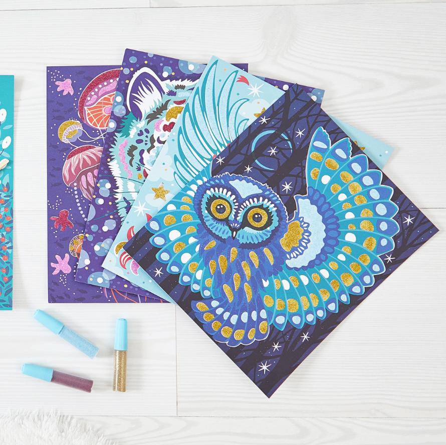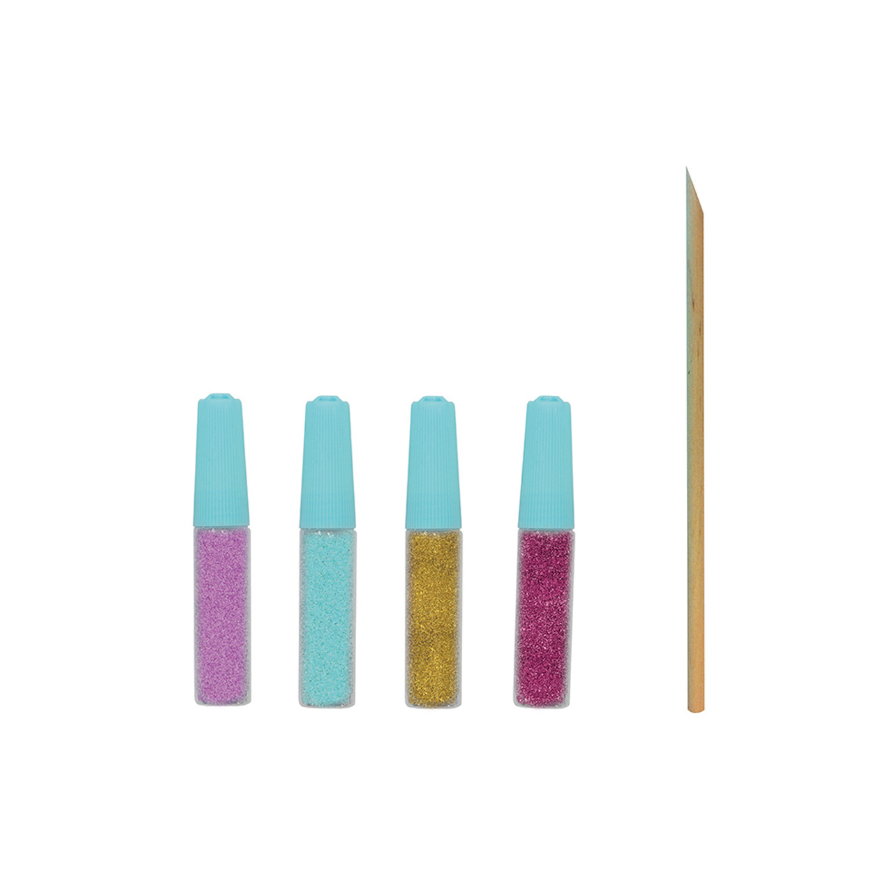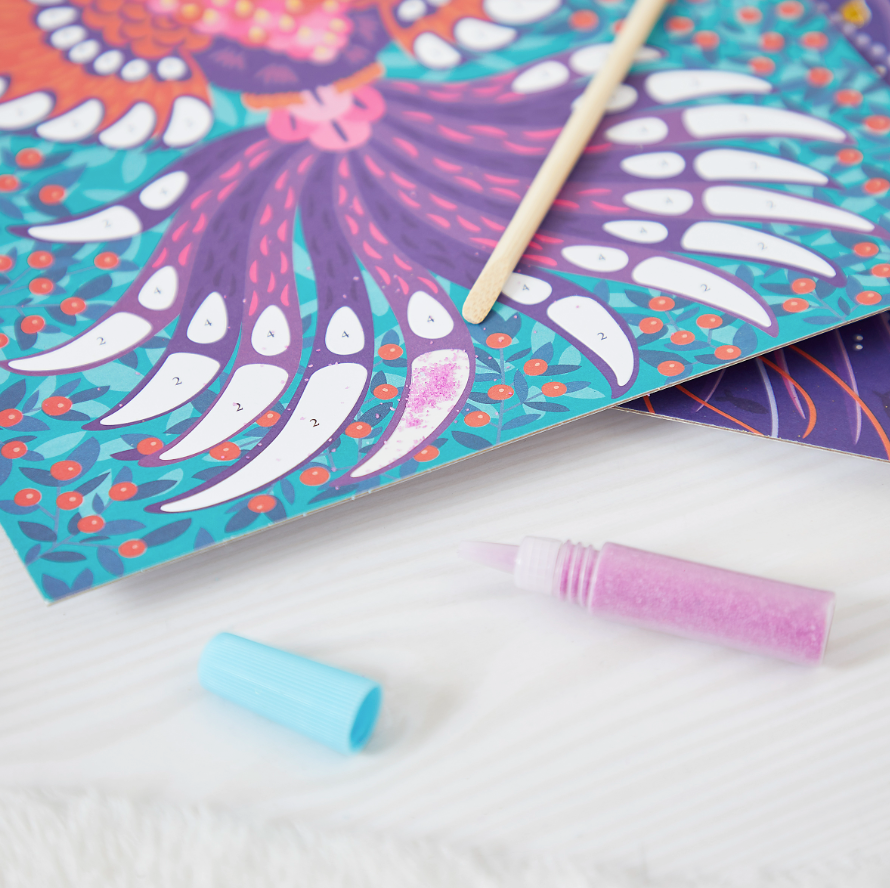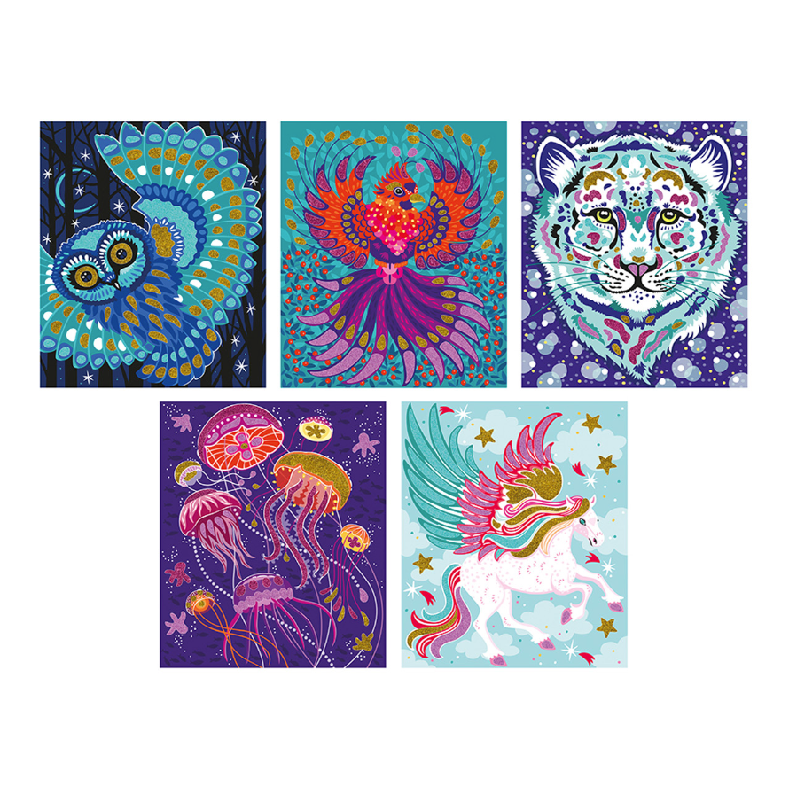 Ontmoet een majestueuze tijger, een schitterende eenhoorn en een betoverende uil! Met deze magische set versieren kinderen 5 prachtige dierenillustraties met zand en glinsterende, biologisch afbreekbare glitter.