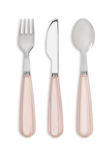 Decoratieve bestekset van duurzaam roestvrij staal met PCTG-grepen. Deze set is precies de juiste maat voor kleine handjes en is een perfecte hulp bij het ontwikkelen van zelfstandigheid tijdens het eten. Bevat in totaal drie delen.