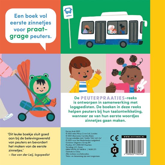 'Peuterpraatjes' is ontwikkeld in samenwerking met een kinderlogopedist en ondersteunt kinderen bij hun taalontwikkeling, waardoor ze snel leren om van losse woorden naar eenvoudige zinnen over te gaan. 'Peuterpraatjes - Daar gaan we!' is een kinderboek voor peuters vanaf 2 jaar.