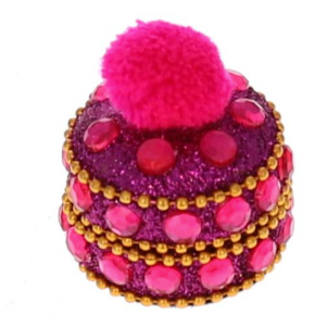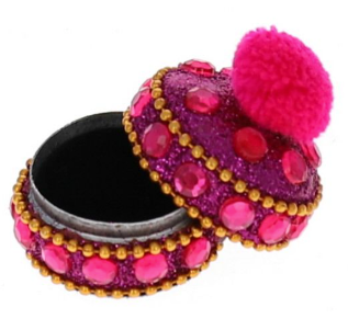 Een klein rond Indiaas doosje gemaakt van roze en veelkleurige kralen en een klein pomponnetje.