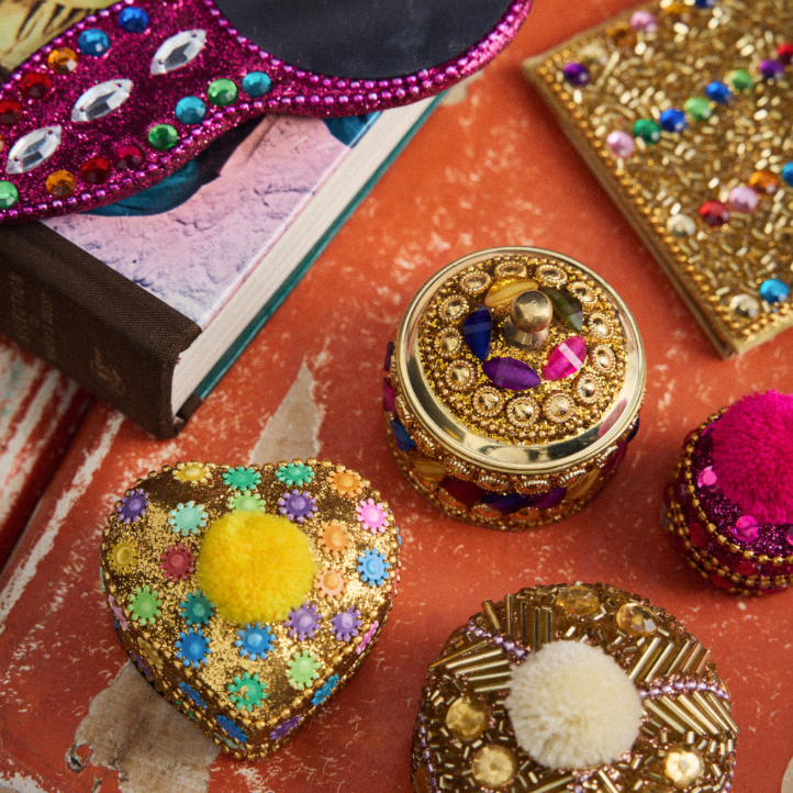 Dit kleine, ronde doosje, dat doet denken aan India, is bedekt met kralen en pailletten en afgewerkt met een katoenen kwastje. Een prachtig cadeau voor sieradenliefhebbers of een traktatie voor jezelf.