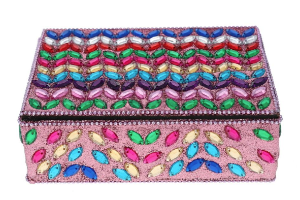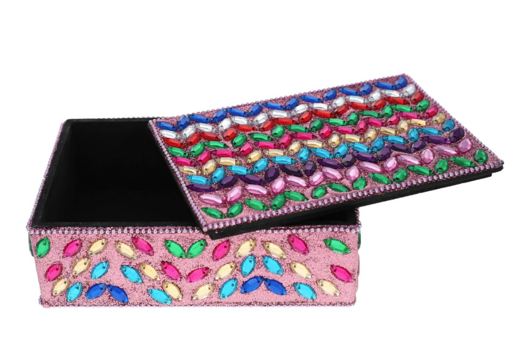 Een mooi rechthoekig Indiaas doosje, versierd met roze en veelkleurige kralen en pailletten.
