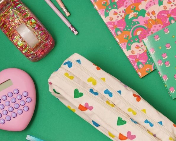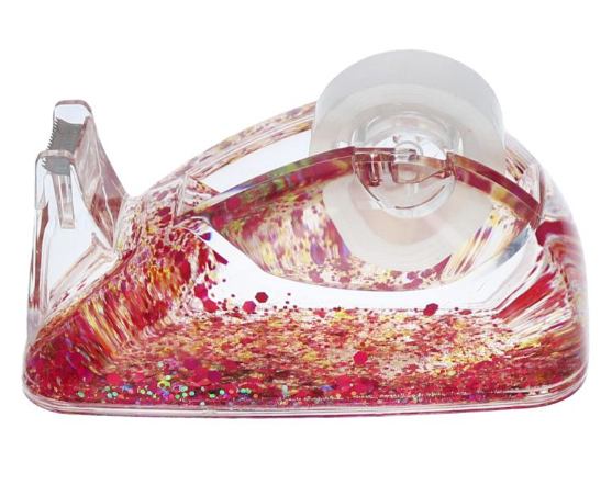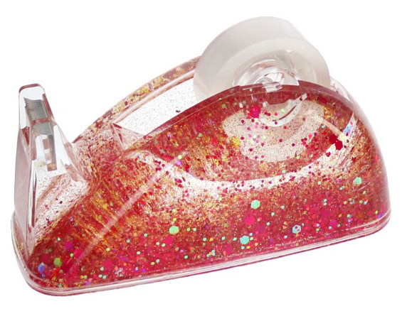 Een plakbandhouder voor transparante plakband met roze en groene glitters.
