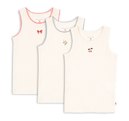 Zachte tanktops gemaakt van zacht biologisch katoen met delicate pointelle- en eyeletdetails langs de zomen. Ideaal om alleen te dragen of als comfortabele en warme binnenlaag. Wordt geleverd in een handige 3-pack. GOTS, biologisch, gecertificeerd door CU1094701