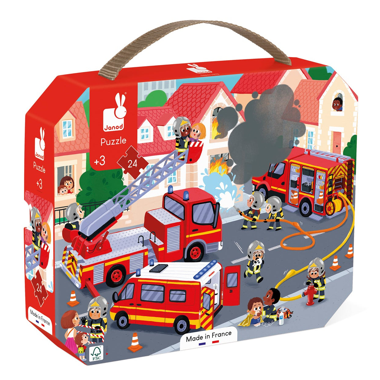 Tuut, tuut, tuut! Het brandweerteam is druk bezig met het blussen van de brand. Deze zeer mooie kartonnen puzzel van 24 stukjes met vele details is ideaal voor de kleine avonturiers en brandweermannen/-vrouwen. Je kind ontwikkelt zijn/haar geheugen en behendigheid met deze mooie kartonnen puzzel van 24 stukjes.