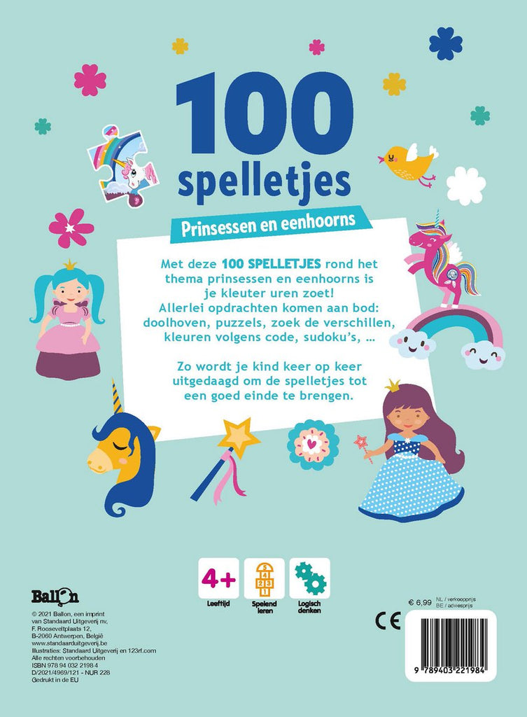 Met deze 100 spelletjes is je kind uren zoet! Doolhoven, puzzels, zoek de verschillen, sudoku's... Je kind zal met veel plezier alle spelletjes oplossen!