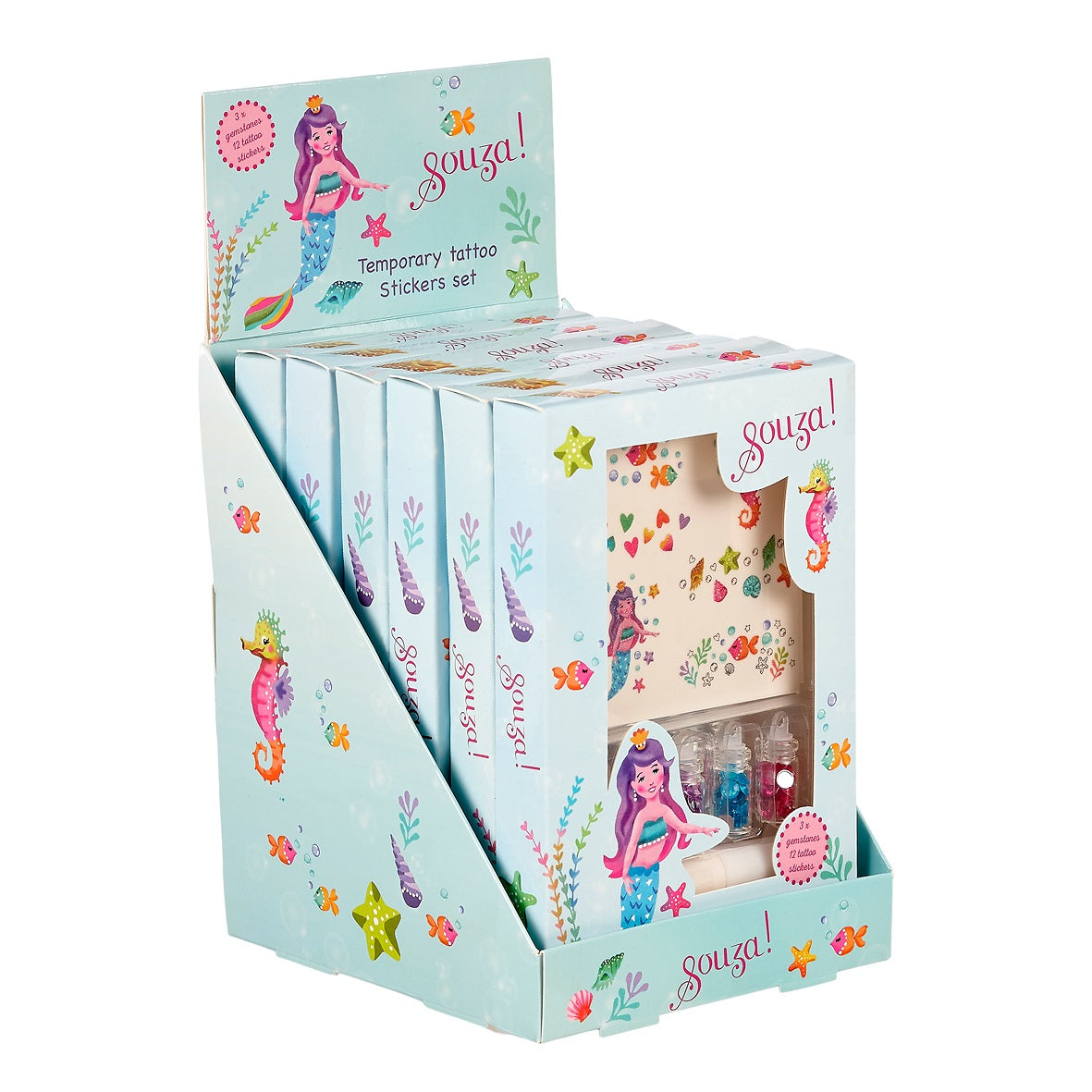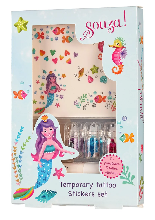 Maak zelf je eigen glitter tattoos met deze handige tattoo set van Souza! Trek je favoriete zeemeerminnenoutfit aan en versier je armen en benen met de mooiste tattoos.