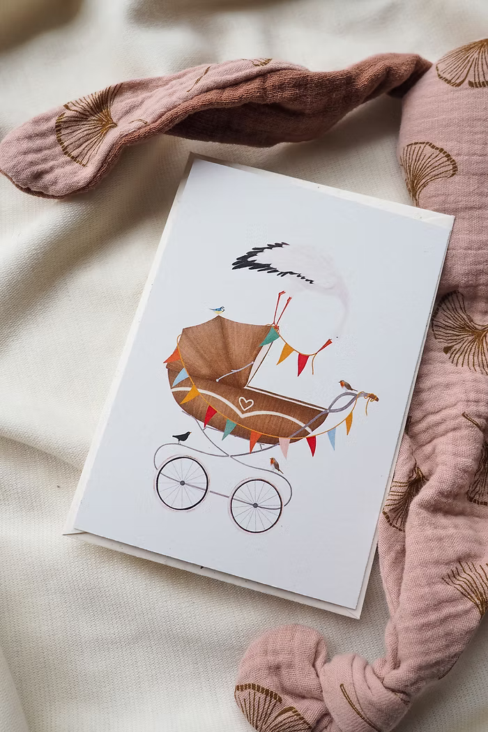 Getekenddoorzusje ansichtkaart welkom lief kleintje kinderwagen