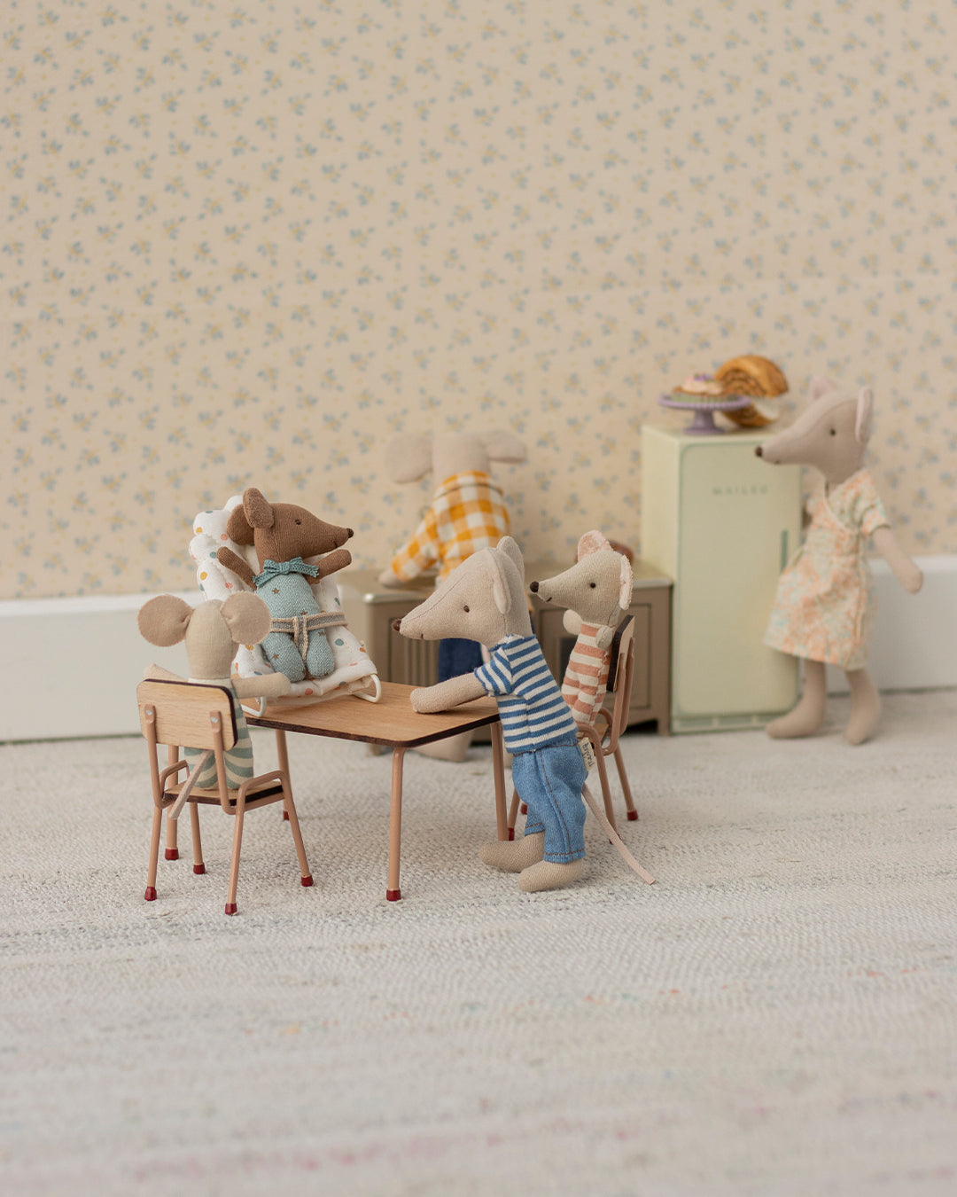 Tafel en stoelenset die past bij de Mouse hole Farmhouse. Gemaakt van beukenhout met metalen poten. Let op de handgemaakte kleurdetails op de poten van de poten - zowel op de tafel als op de stoelen. De set wordt geleverd met 2 stoelen.