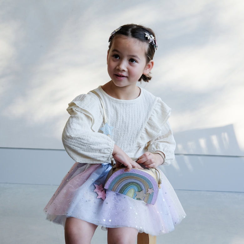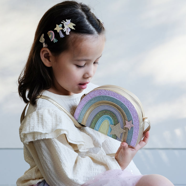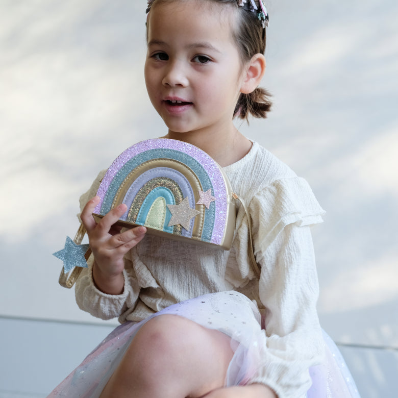 Onze Dreamland regenboogtas is een perfecte mix van glitter, glitters en pastelkleuren! Met voldoende ruimte voor hun kleine schatten, zorgt deze tas gegarandeerd voor een beetje magie bij elke outfit!