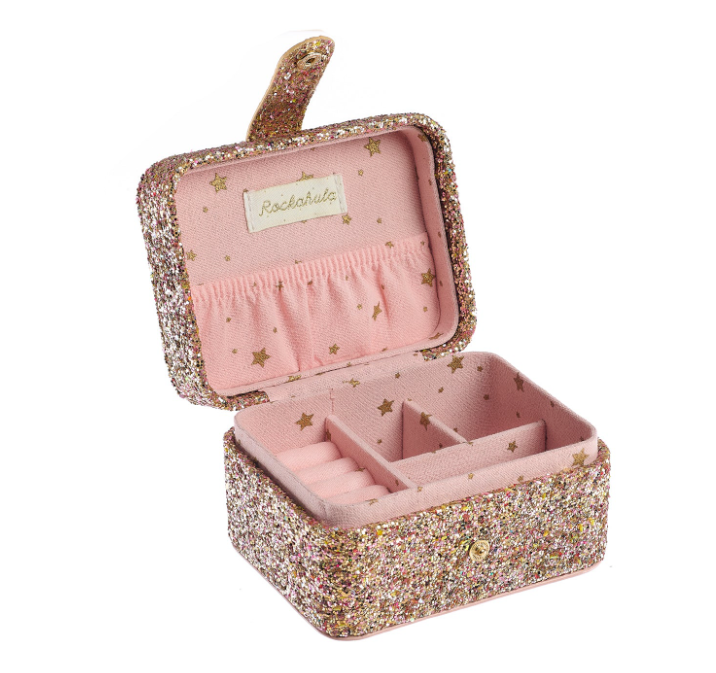 De doos is volledig bedekt met fonkelende roségouden glitter en opent met een handige drukknoop. Binnenin vind je vier aparte vakjes, een schuifvakje én een speciaal plekje om oorbellen en ringen netjes op te bergen.