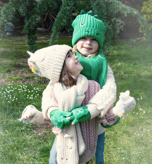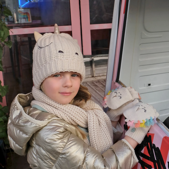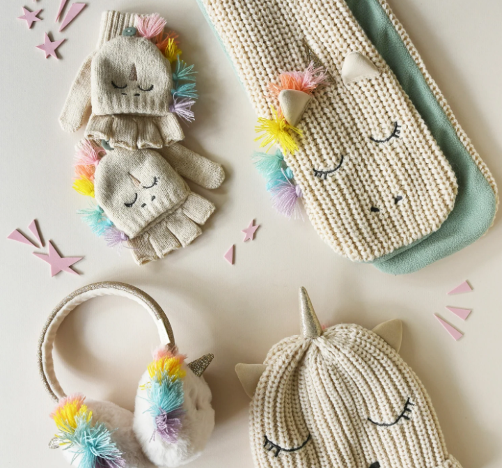Wij geloven in uincorns! Jij toch ook? Mooie vingerloze handschoenen met een geborduurd unicorn-gezicht, glinsterende gouden hoorn en regenboog-manen. Ze hebben een fleece-gevoerde kap die je met een knop kunt vastzetten, en de duim is omsloten.