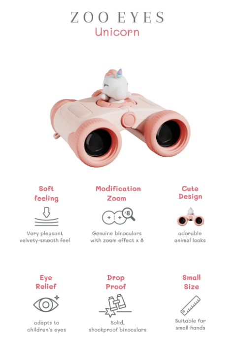 Voeg een vleugje magie toe aan elk avontuur met onze verrekijker in eenhoorn-design! De Zoo Eyes Eenhoorn combineert een betoverend design met topfuncties, zoals 8x zoom, een zachte siliconen afwerking en verstelbare oogafstand voor optimaal kijkcomfort. Gemaakt om de verbeelding en nieuwsgierigheid te prikkelen, is hij schokbestendig en klaar voor elk magisch avontuur. Perfect voor kleine dromers die de schoonheid van de wereld willen ontdekken met een sprankje magie!