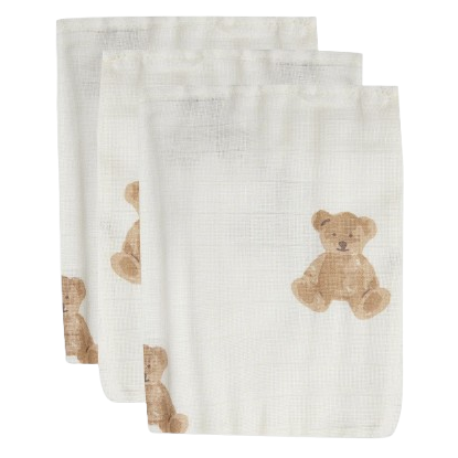 Hydrofiele washandjes zijn handig tijdens het badderen van jouw kleine baby. Ook altijd bruikbaar voor die snelle ochtend wasbeurt op het aankleedkussen. Je hand past gemakkelijk in het washandje formaat en de hydrofiele stof is zacht voor de tere babyhuid. Door de dunne gladde stof kun je gemakkelijk de huidplooitjes of onder het kinnetje komen zonder de huid te beschadigen. Ook handig voor onderweg om vieze mondjes en vieze handjes mee te poetsen. Door het kleine formaat gaan ze ook makkelijk mee in de logeerkoffer. De washandjes worden standaard geleverd in een 3-pack. Omdat je van washandjes altijd meer kunt gebruiken. Alle washandjes in de verpakking hebben een lieve all-over print van teddy beertjes uit het Teddy Bear thema. De doekjes kun je lekker heet uitwassen, ze altijd weer hygiënisch te gebruiken zijn. Je mag ze wel strijken, maar slim om dat juist niet te doen. Ongestreken hydrofiel neemt meer vocht op.
