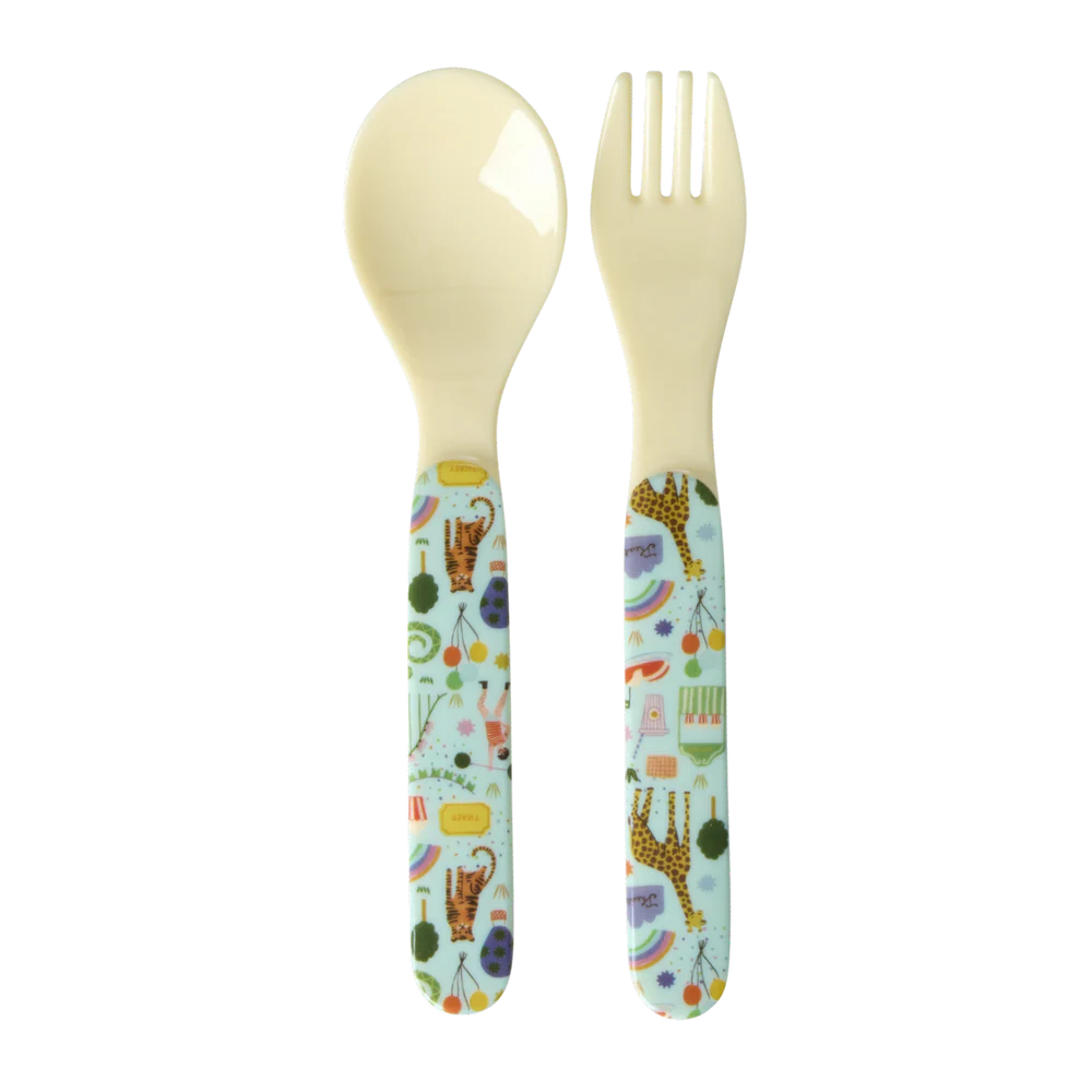 Het leukste bestek (vork en lepel) met de "Fun Fair" (Kermis) print in blauwe tinten. Het bestek is gemaakt van melamine wat een duurzaam materiaal is en ideaal voor dagelijks gebruik, omdat het sterk en ook makkelijk schoon te maken is. Melamine absorbeert geen kleur of smaak van voedsel, dus de kleintjes kunnen zonder problemen allerlei nieuwe smaken ontdekken.