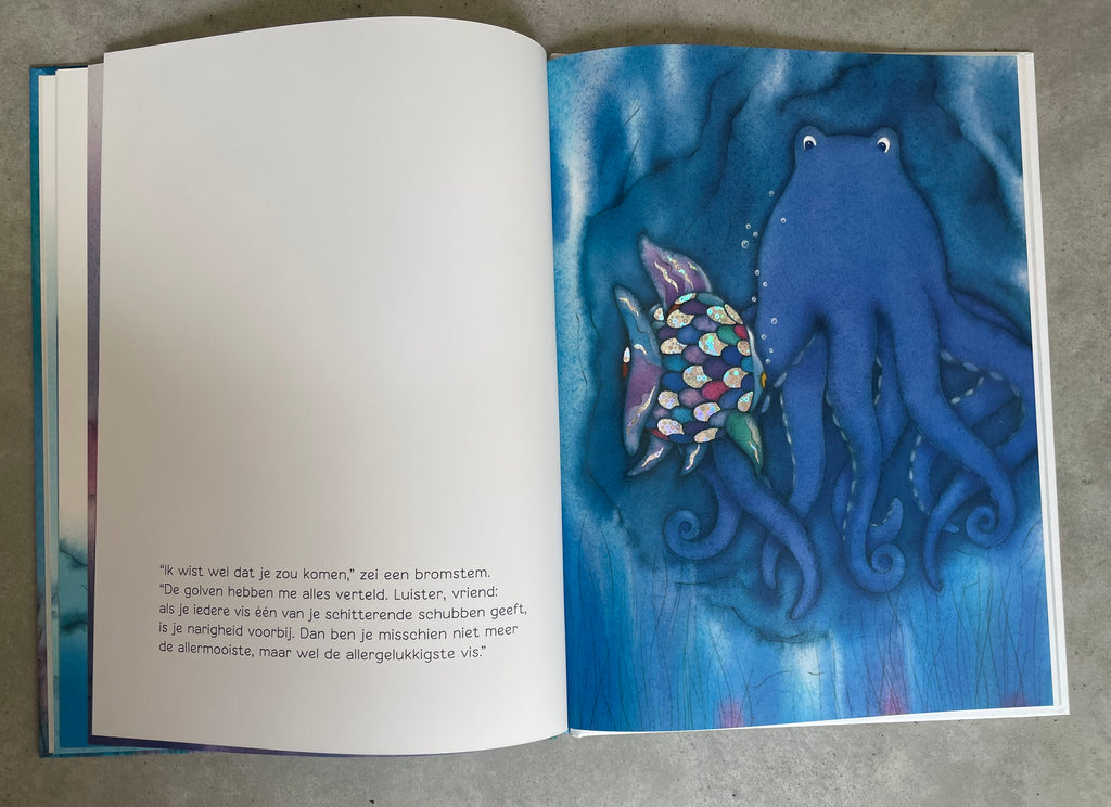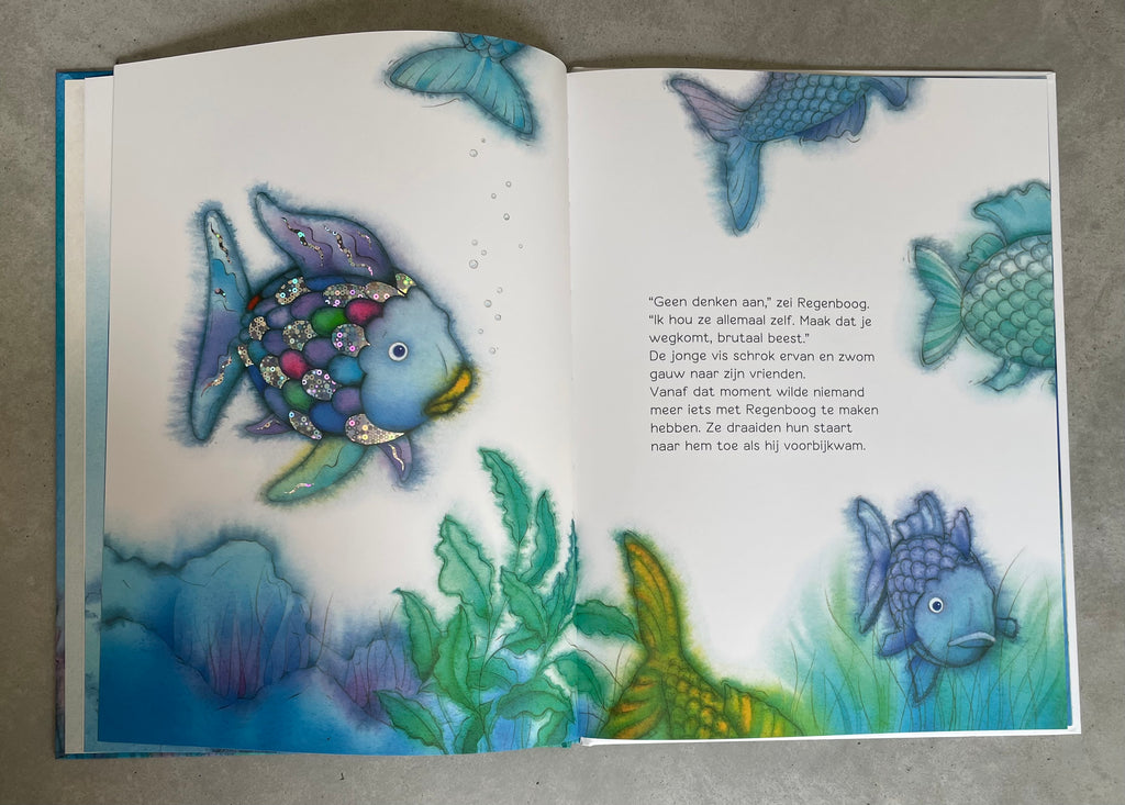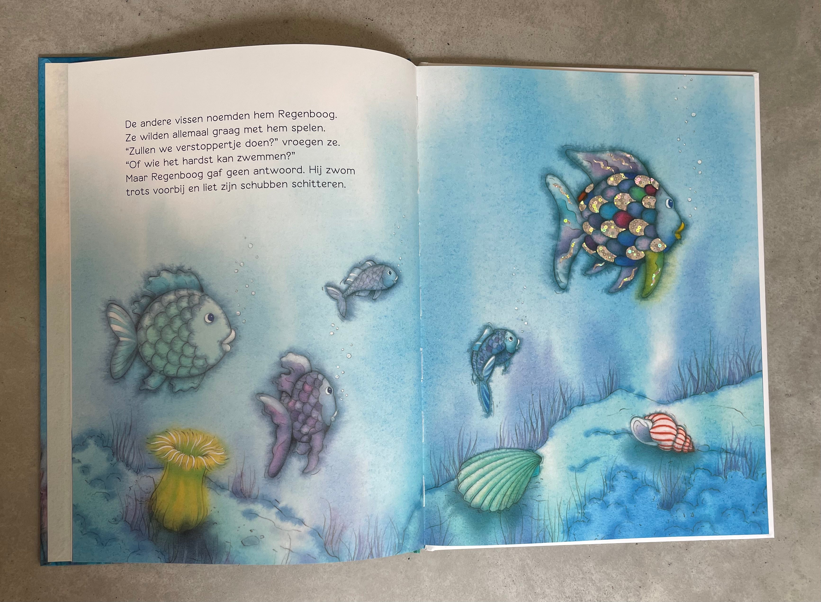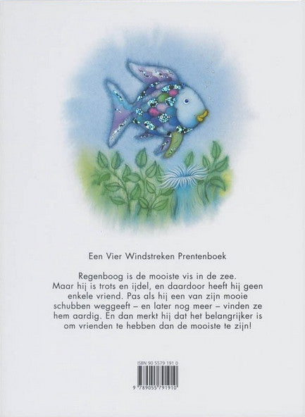 Regenboog is de mooiste vis in de zee. Maar hij is trots en ijdel, en daardoor heeft hij geen enkele vriend. Pas als hij een van zijn mooie schubben weggeeft - en later nog meer - vinden ze hem aardig. En dan merkt hij dat het belangrijker is om vrienden te hebben dan de mooiste te zijn!