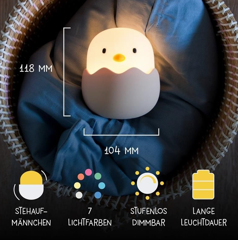 Prachtig zacht siliconen nachtlamp wat eenvoudig indrukbaar is om het aan of uit te zetten. USB-C oplaadbaar, kan wel 200 uur branden, heeft verschillende lichtstanden en kan van kleurmodus veranderen in allerlei kleuren of warm wit licht. Ideale lamp voor de kinderkamer.